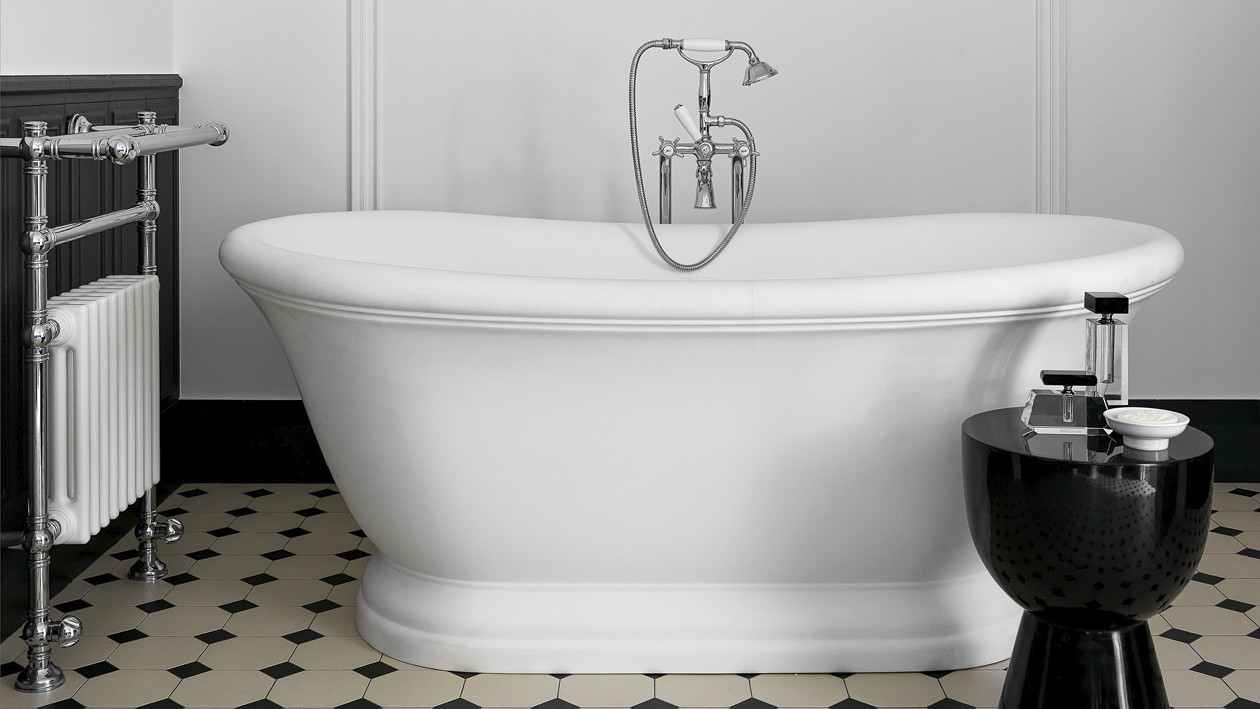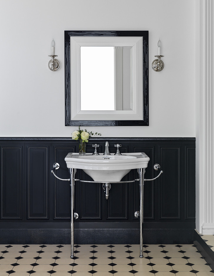 In the bathroom, stylistic continuity is ensured by the sculptural outline of the Aurora bathtub and the timeless elegance of the New Etoile console, the Plaza mirror, the Daisy lamp and the Heritage floor.