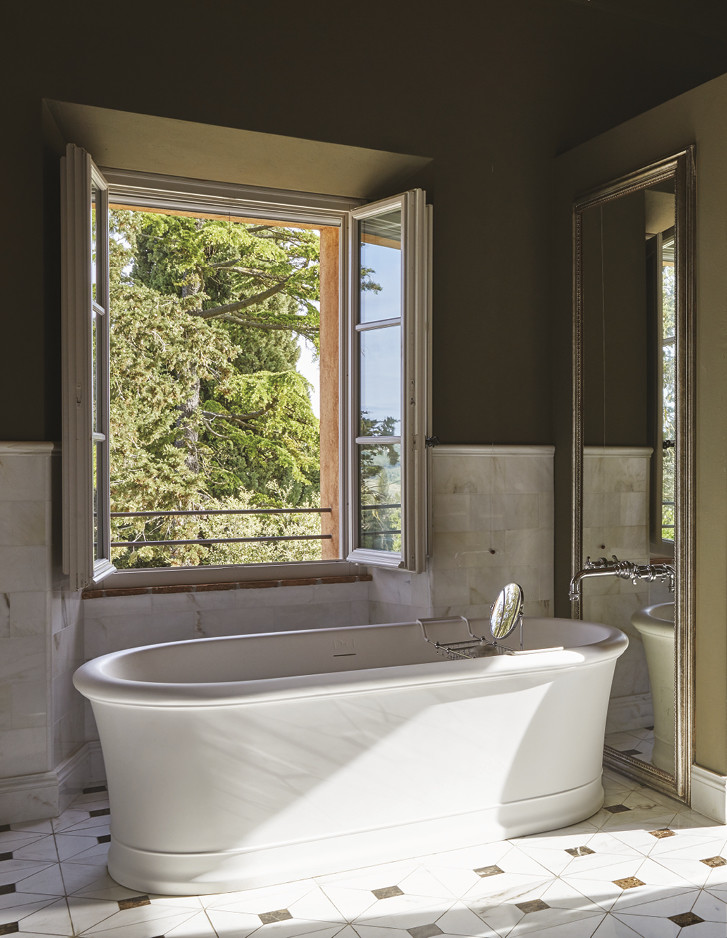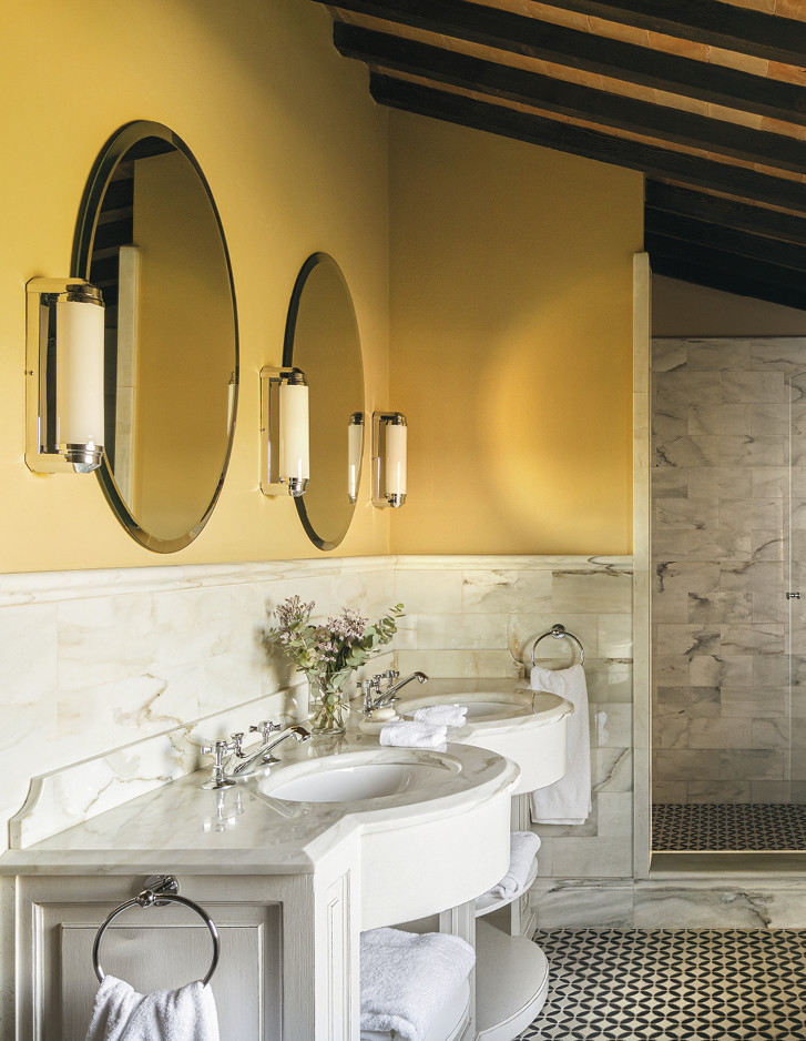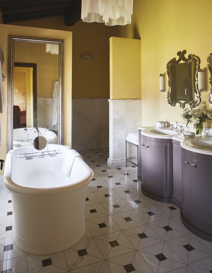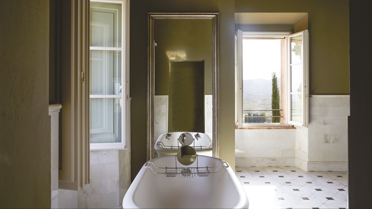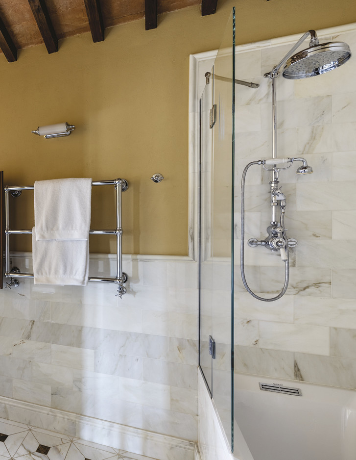 Das Castello di Casole liegt in einer der eindrucksvollsten Gegenden der Provinz Siena und gehört zu einem der größten privaten Landgüter Italiens. Es ermöglicht seinen Gästen, ganz in die Natur und die Geschichte der Toskana einzutauchen. Die Reise in die Vergangenheit beginnt mit zwei von Zypressen gesäumten Alleen, die zur Spitze eines sanften Hügels führen, wo sich das Hauptgebäude der Burg befindet, deren Ursprünge auf das 10. Jahrhundert zurückgehen. Das Anwesen liegt inmitten eines 1700 Hektar großen Areals, das mit Olivenbäumen und Weinreben bepflanzt ist, aus denen weltberühmte Öle und Weine gewonnen werden. In den 38 Zimmern, Suiten und Appartements mit Blick auf die prächtigen mit Rosen- und Zitronenbäumen bepflanzten Gärten fühlt sich der Reisende sofort wie ein Gast und reiht sich damit in eine lange Tradition ein, denn in diesem Gebäude residierten im Laufe der Zeit bereits Angehörige der wichtigsten Königshäuser und Filmstars. Die sorgfältig restaurierten Innenräume sind eine Hommage an die Vergangenheit, ohne das man auf modernen Komfort verzichten muss. Die Arbeiten wurden von ortsansässigen Handwerkern unter Anwendung traditioneller Techniken und unter Wiederverwendung von Holzbalken, Keramik und Terrakottafliesen durchgeführt, die sich bereits auf dem Anwesen befanden. Freigelegte oder handverputzte Steinmauern sowie die Wahl traditioneller Naturholzmöbel und neutraler Farben tragen zu einer einzigartigen und entspannten Atmosphäre bei. Diese Philosophie der Gastfreundschaft wurde auch bei der Auswahl für die eleganten Bäder zugrunde gelegt, in denen einige der bekanntesten Produkte von Devon&Devon wie die freistehenden Badewannen Celine und Fusion, das Waschtischmöbel Regent sowie die Lampen Savoy und Tube perfekt in Szene gesetzt wurden.