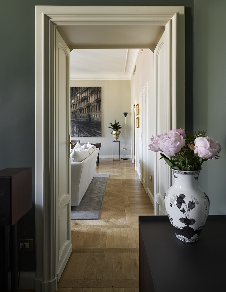 Im historischen Stadtteil Brera ließ das Architekturbüro Arassociati durch ein aufwendiges und konservatives Restaurierungsprojekt eine repräsentative Wohnung aus dem 19. Jahrhundert zu neuem Leben erwachen. Der ursprüngliche Charme des Bauwerks und der Inneneinrichtung wurde durch den Erhalt von Türen und Decken vollständig erhalten. Im großen Hauptbadezimmer duettiert das strahlende Weiß der Wandverkleidungen und Bodenbeläge aus Marmor mit dem Salbeigrün des Waschtischmöbels Double Season, hier in einer maßgefertigten Version, und passt zur klassischen Wesentlichkeit der Sanitärkeramik Westminster und der Accessoires First Class. Individuelle Lösungen finden sich auch in den Gästebädern, in denen das maßgefertigte Möbelstück Season und der Waschtisch New Etoile, die Bodenbeläge Elite und die Wandverkleidungen Simply ihren perfekten Platz finden.