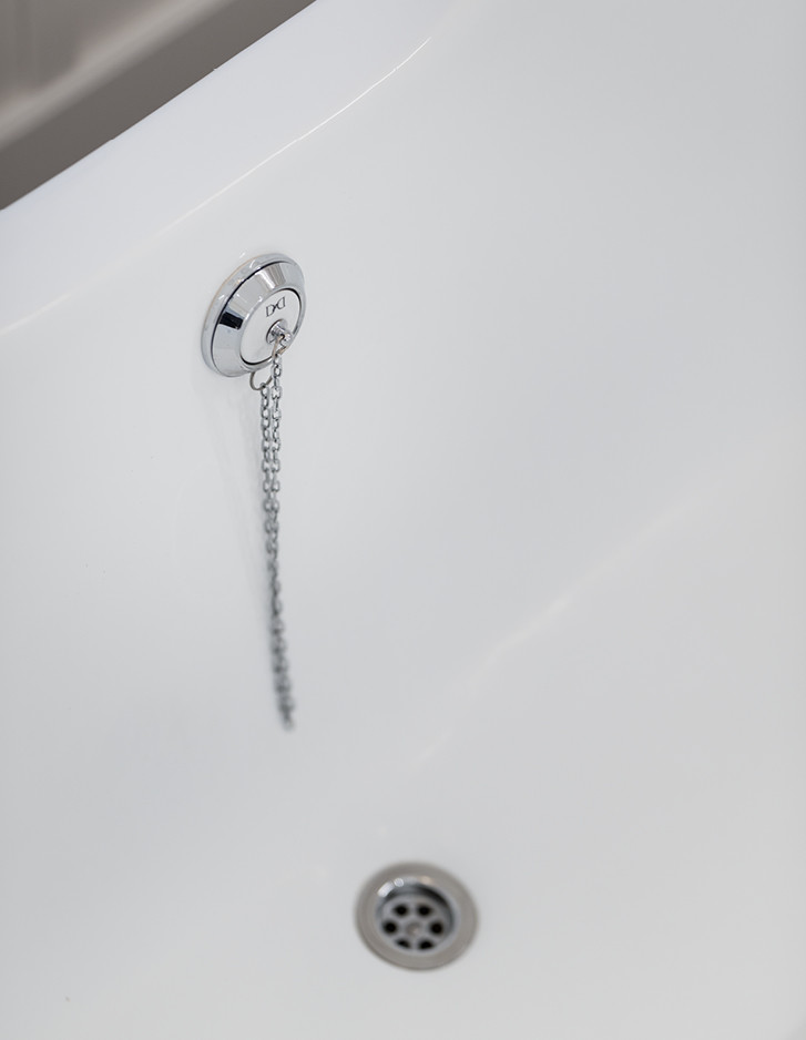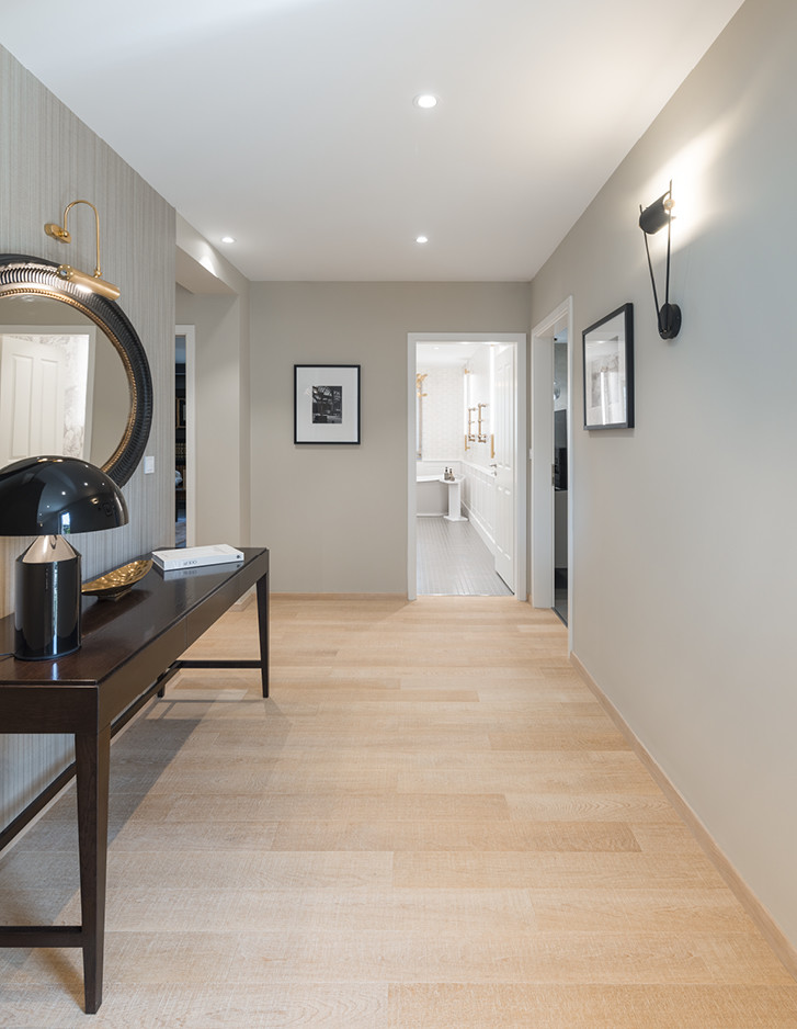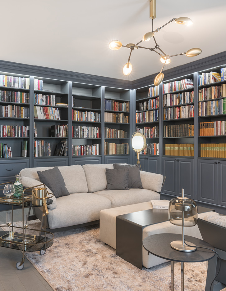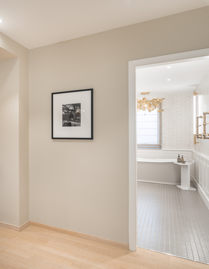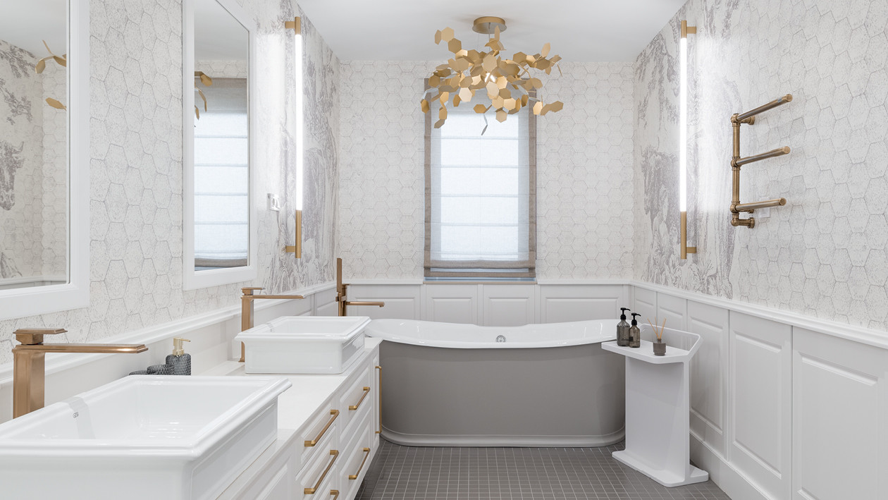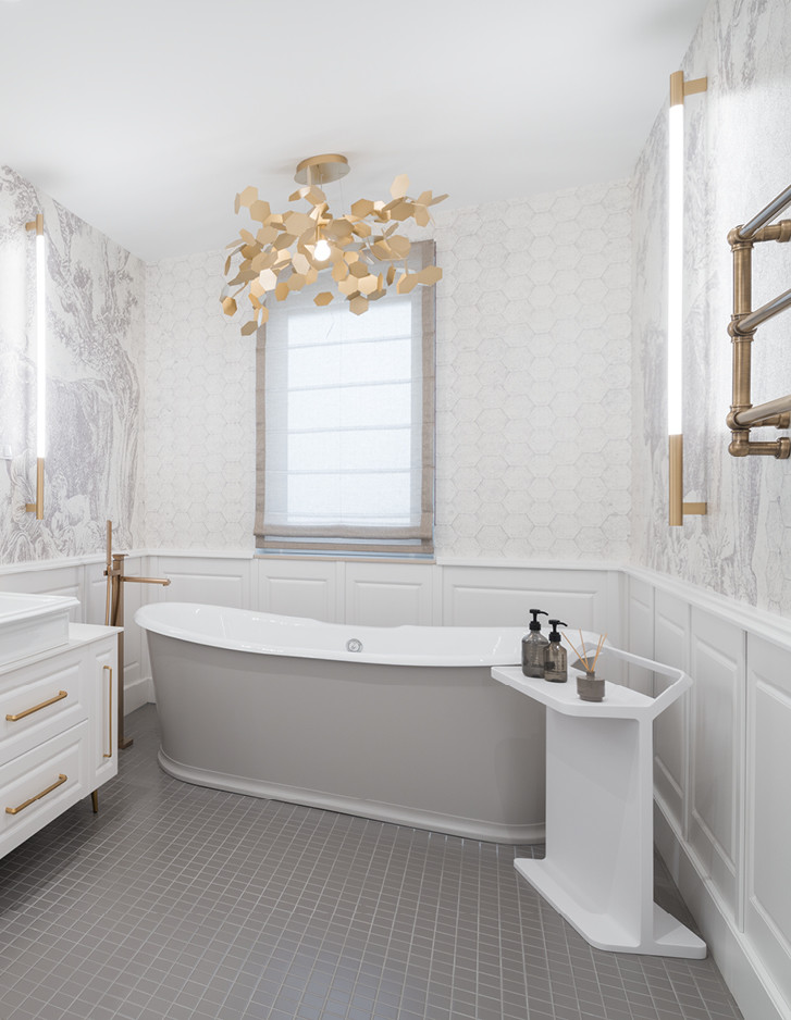 Eine gelungene Mischung aus nostalgischen Akzenten und zeitgenössischen Elementen, klassischer Schlichtheit und typisch britischem Humor charakterisiert dieses besondere Familienhaus, das vor kurzem von Fanni Sokorai-Gyurics und Mónika Szommer des Büros Motifa design renoviert und erweitert wurde. Den Mittelpunkt des Hauses, dessen Eigentümer leidenschaftliche Buch- und Gemäldesammler sind, bilden eine Bibliothek im elegant-klassischen Stil sowie ein heller Korridor, der nicht nur die beiden Gebäudeflügel miteinander verbindet, sondern auch als Bildergalerie dient. Die Pastellfarben und sorgfältigen Details der Privatzimmer, wie beispielsweise die Kassettentüren der beiden begehbaren Garderoben, lassen eine innige und vertrauliche Atmosphäre entstehen, die auch das Hauptbadezimmer charakterisiert. Zentrales Element ist die freistehende Badewanne Regal Colors aus Gusseisen mit Verkleidung aus grauem Aluminium. Die effektvoll von einer edlen, vergoldeten Hängelampe beleuchtete Badewanne bildet einen perfekten und harmonischen Kontrast zu den schlichten, fast minimalistischen Flächen und Einrichtungselementen.