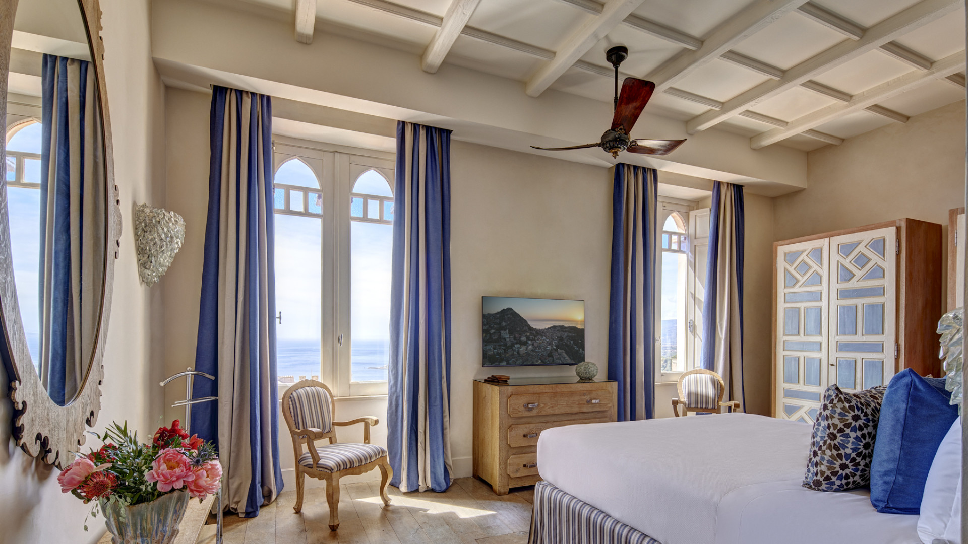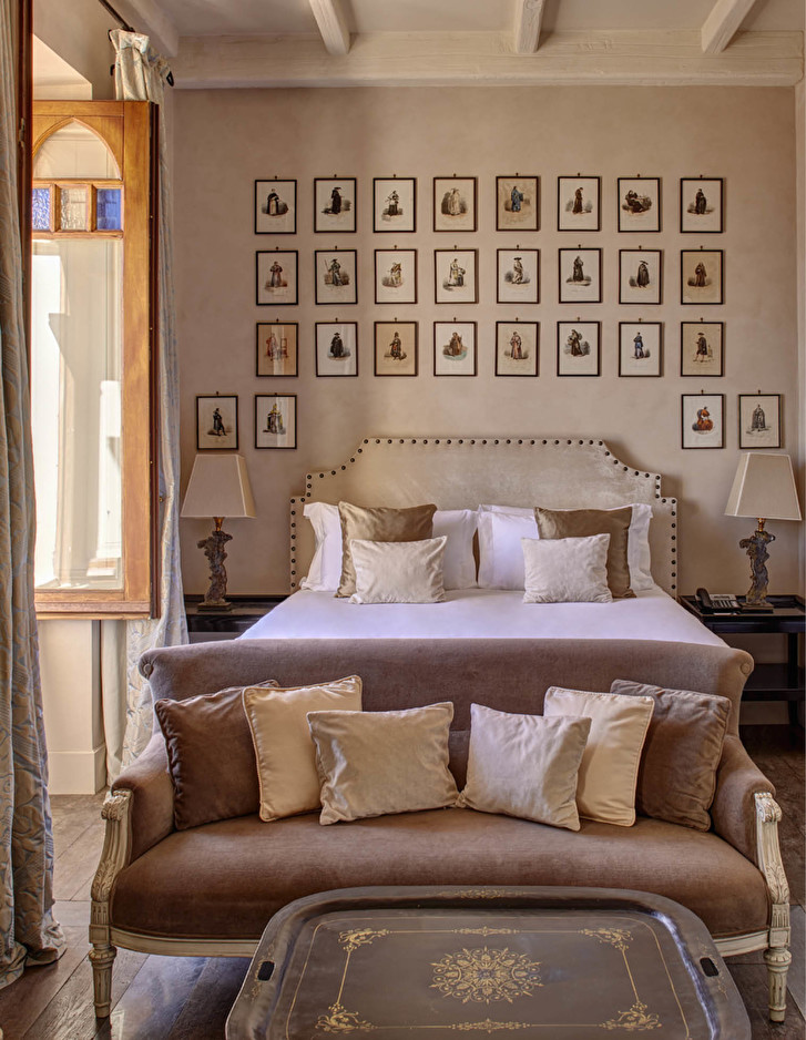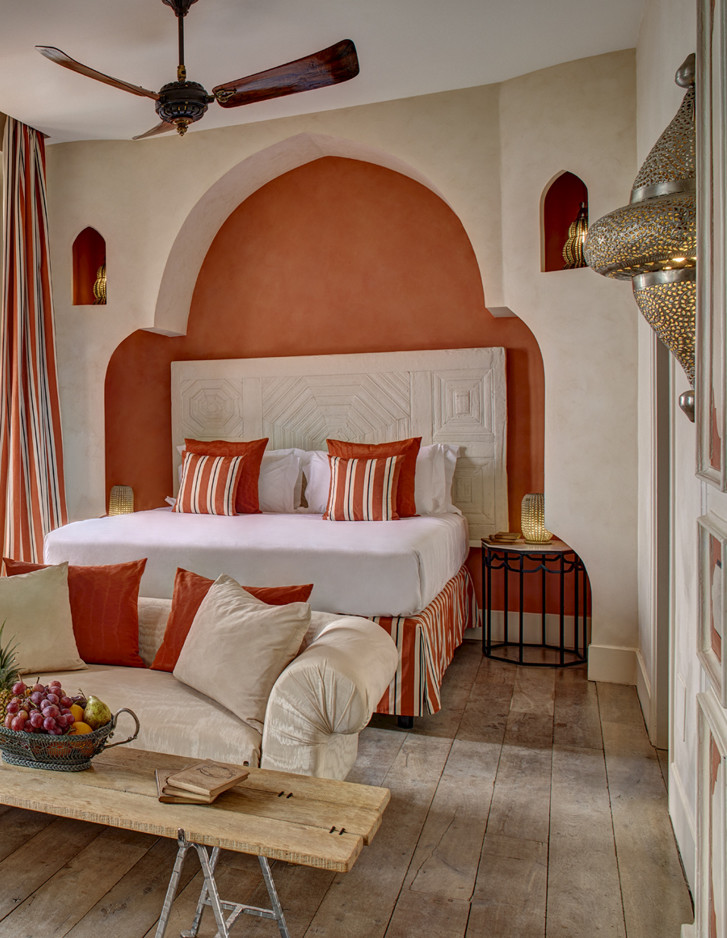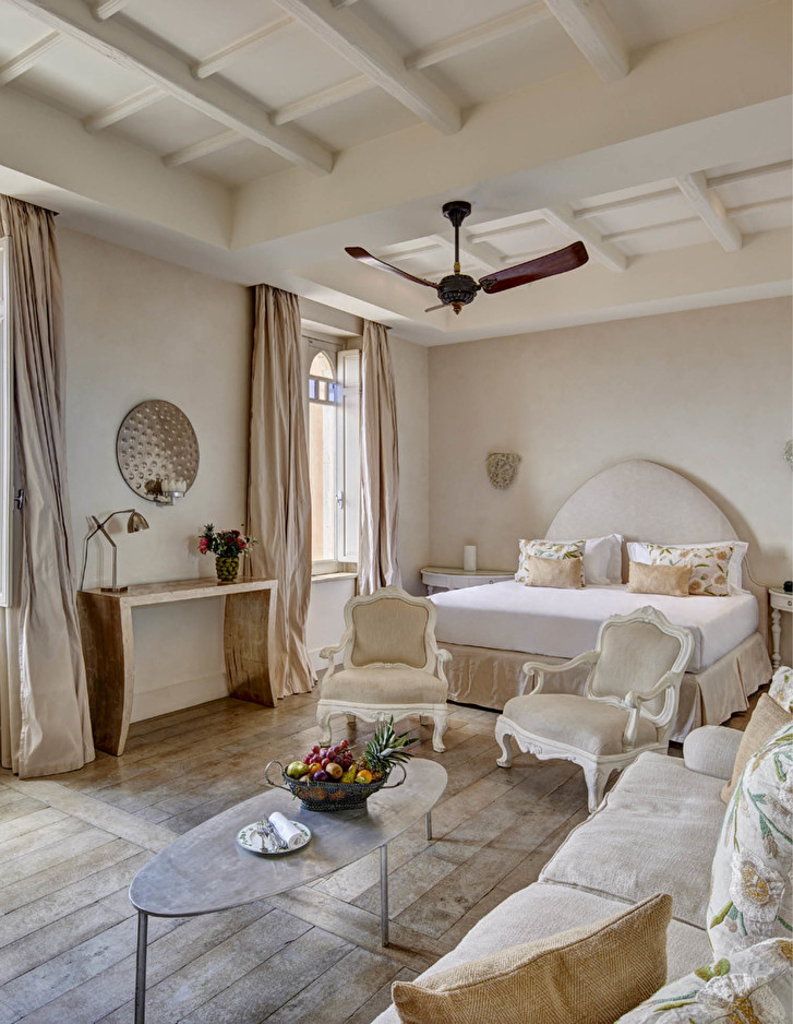 In jeder der Suiten wird der ästhetische Synkretismus durch eine chromatische Symphonie harmonisch ausgeglichen, in der die makellos weißen Decken einen hellen Kontrapunkt zu Puderblau, Beige und Koralle bilden.