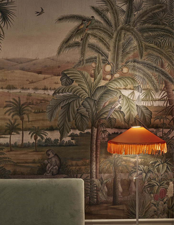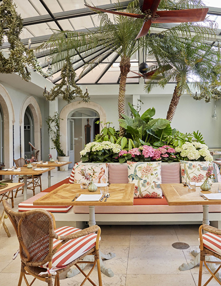 Eine Hommage an die Tradition der sizilianischen Privatresidenzen des frühen 20. Jahrhunderts ist dagegen die prächtige Orangerie im Kolonialstil, die mit Rattanmöbeln eingerichtet ist und die Gäste in einem fantasievollen, immaginären mediterranen Palmengarten empfängt, der kunstvoll auf die Tapeten gezeichnet ist.