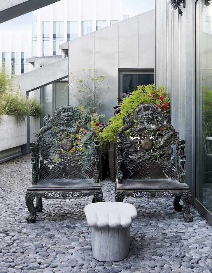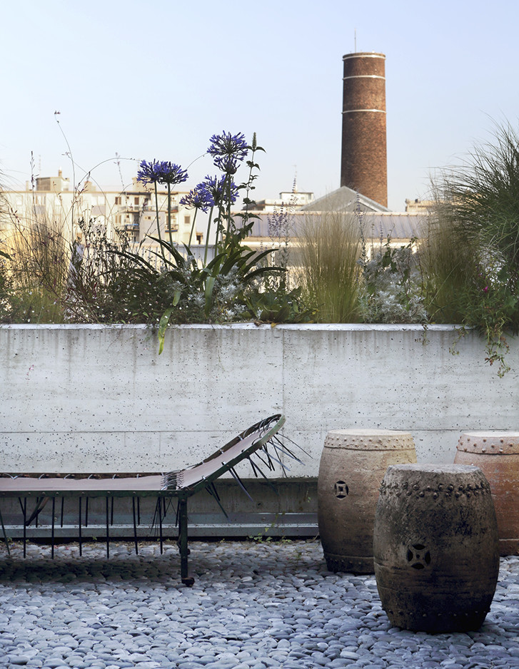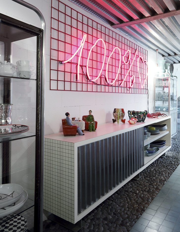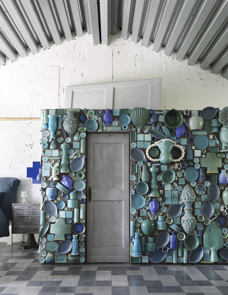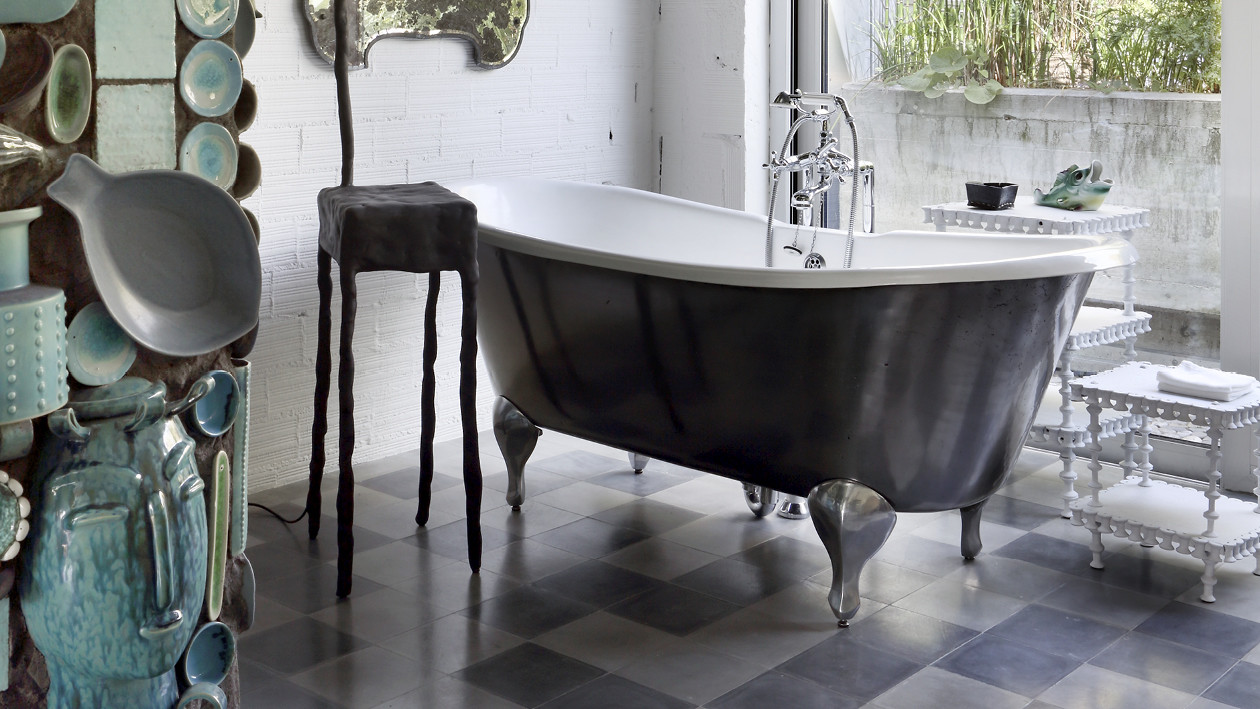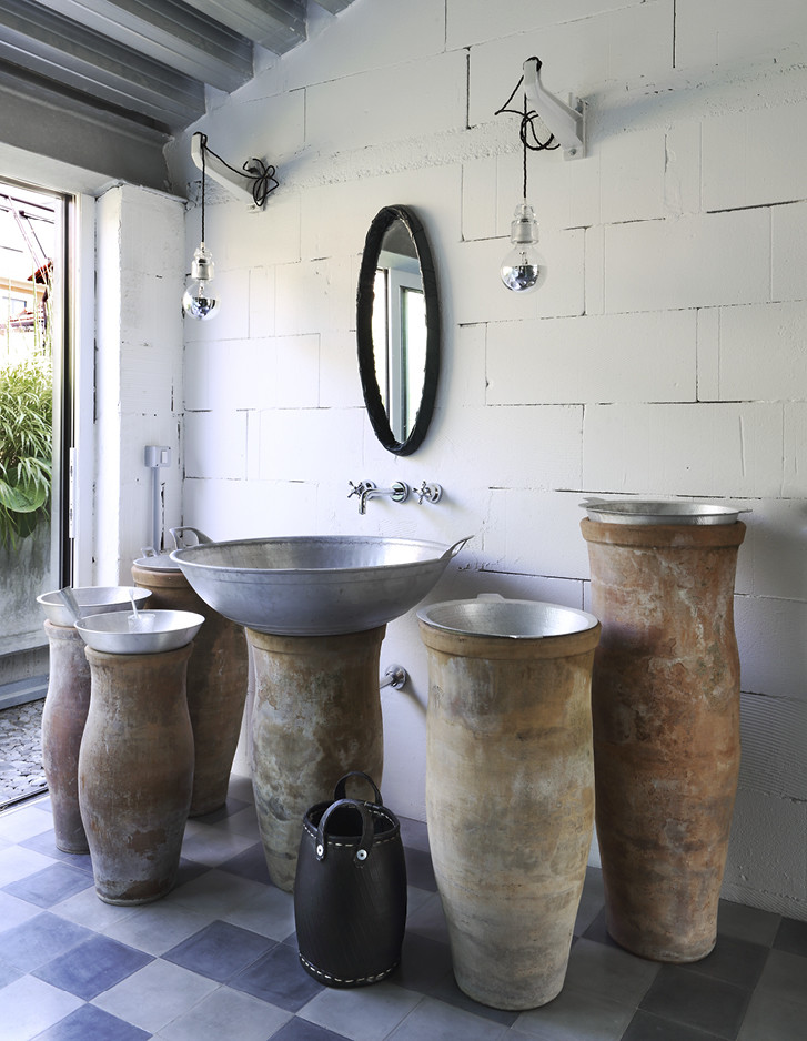 Das unkonventionelle Zuhause von Paola Navone befindet sich im ersten Stock eines Hangars in der Gegend von Tortona. Unter einem gefalteten Zinkdach, das sowohl an die Dächer von Haussmann als auch an die Industriearchitektur erinnert, befindet sich eine scheinbar endlose Reihe von kommunizierenden Wunderkammern, die es zu erkunden gilt, wenn man seinen Blick von Detail zu Detail schweifen lässt. Als Architektin, Designerin, Innenarchitektin und Art-Direktorin hat Navone in diesem großen Container die Objekte zusammengetragen, die ihr auf ihren langen nomadischen Reisen "unterwegs begegnet sind". Sie hat sie zu Kollektionen zusammengestellt, die immer wieder durch die Kühnheit ihrer Kombinationen verblüffen, wie zum Beispiel das Nebeneinander von französischer Keramik, Köpfen aus Pappmaché, die sie in Singapur auf der Straße aufgelesen hat, und japanischen Utensilien, die wie Skulpturen angeordnet sind. Alle Räume, angefangen bei der langen Korridor-Galerie, sind ein Schaufenster voller Geschichten und Wunder. Ihre Sammlerleidenschaft wird im Schlafzimmer zu einer regelrechten Installation, in deren Mittelpunkt eine beeindruckende Wand steht, die von unzähligen keramischen Artefakten in schier unendlichen Türkistönen geformt ist und das Badezimmer umgibt. Selbst im intimsten Bereich der Wohnung findet sich eine Abfolge von theatralischen Elementen, die ihren surrealen Höhepunkt in den aus Terrakotta-Töpfen kreierten Waschbecken mit Aluminium-Woks und schließlich der Silhouette der Badewanne Admiral Lux im Stil des neunzehnten Jahrhunderts finden, deren prächtige Außenhülle sich in von Hand poliertem Gusseisen präsentiert.