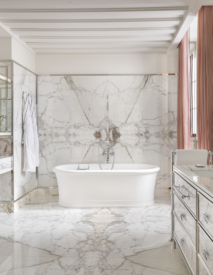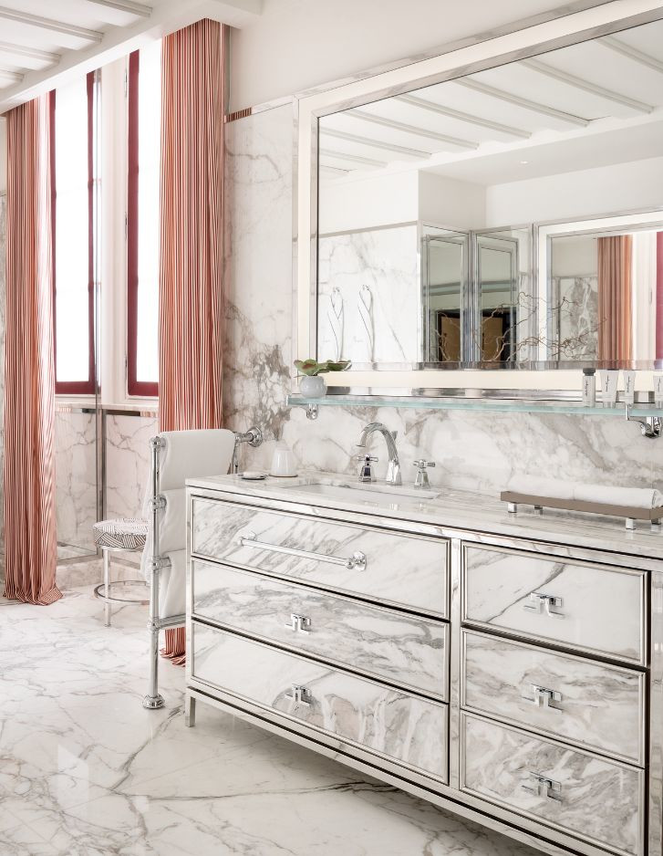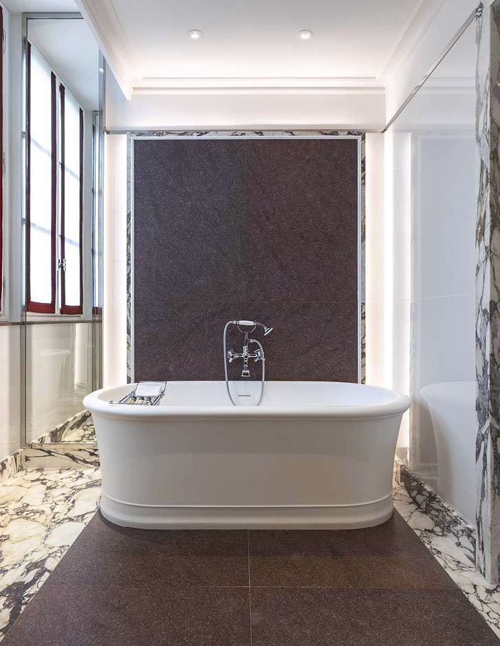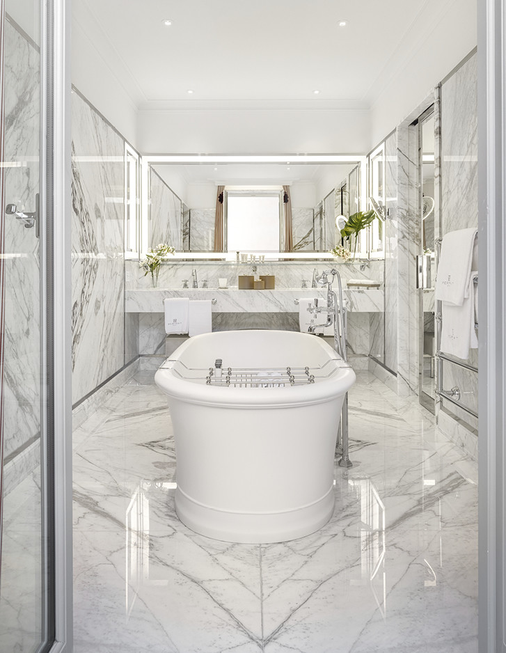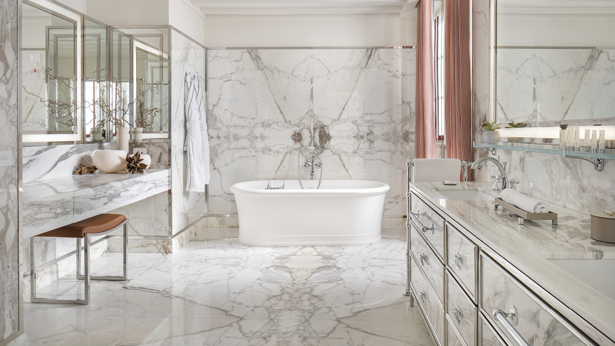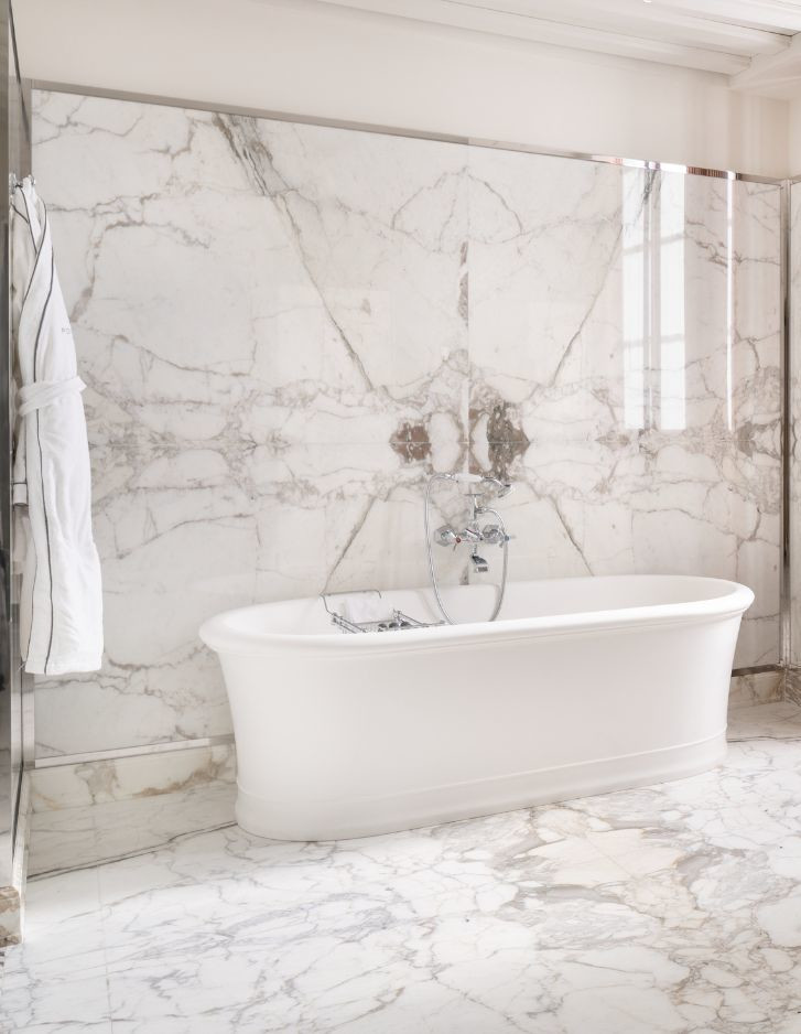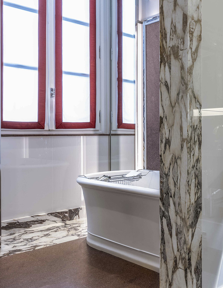 Errichtet im Jahr 1564 von San Carlo Borromeo und von Federico Borromeo in ein monumentales barockes Meisterwerk umgewandelt, ist das prächtige ehemalige Erzbischöfliche Seminar von Corso Venezia heute das Portrait Milano, das neue Juwel der Fünf-Sterne-Hospitalität unterzeichnet von der Lungarno Collection, dem Hotelunternehmen der Familie Ferragamo. Die Umwandlung des Seminars - das im Laufe der Jahrhunderte auch eine Bibliothek, eine Druckerei und ein kreatives Labor des weltbekannten Architekten Mario Bellini war - wurde dem architektonischen Wissen des Architekten Michele De Lucchi und dem unverwechselbaren Stil des Innenarchitekten Michele Bönan anvertraut. Ruhig und zurückhaltend, mit Blick auf die hellen verglasten Loggien oder den schönen Garten, wurden die Zimmer und Suiten der neuen Adresse für Luxushospitalität in Mailand inspiriert von den Mailänder Salons der 1950er Jahre gestaltet, die durch Lärchenböden, helle Walnussmöbel, Paneele aus Rattan, die die Wände schmücken, sowie den großzügigen Einsatz von Rot und Grün widerhallen. Die Griffe aus Leder und brüniertem Messing an Türen und Schränken sowie die Oberflächen der Badezimmer in Carrara-Marmor oder Breccia Medicea, einem Marmor, der von der Familie Medici besonders geliebt wurde und im 16. Jahrhundert in ihren florentinischen Residenzen weit verbreitet war, verweisen hingegen ausdrücklich auf die authentischste toskanische Handwerkstradition. Die klassische und essentielle Eleganz der Celine White Badewanne in White Tec Plus stammt ebenfalls aus Florenz und wird in den exklusivsten Suiten verwendet.