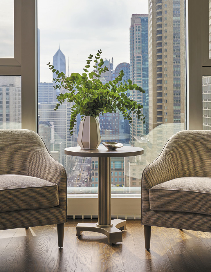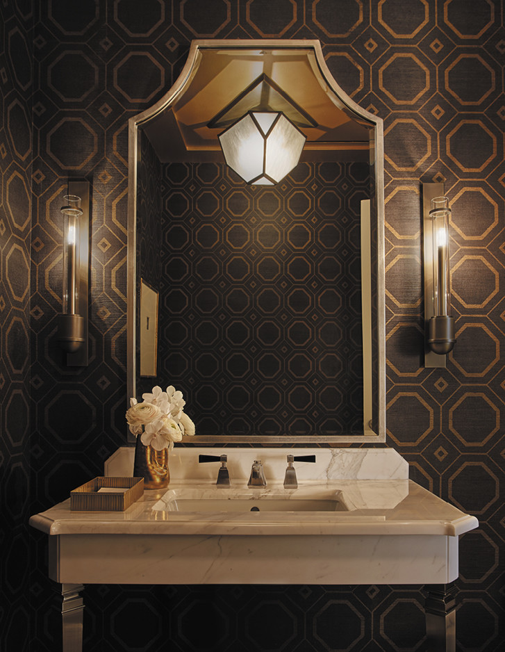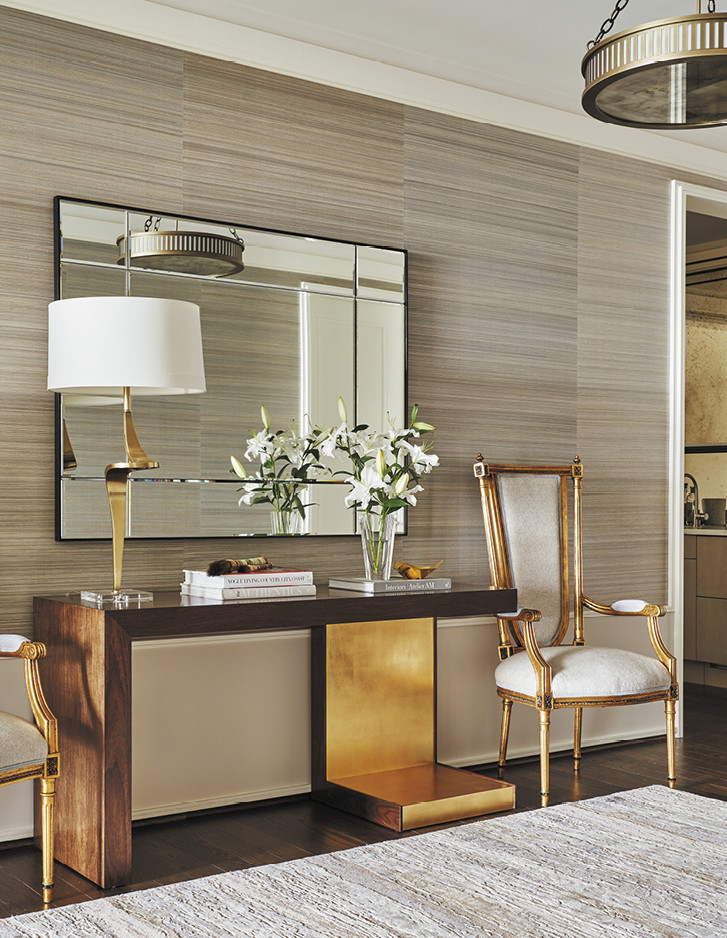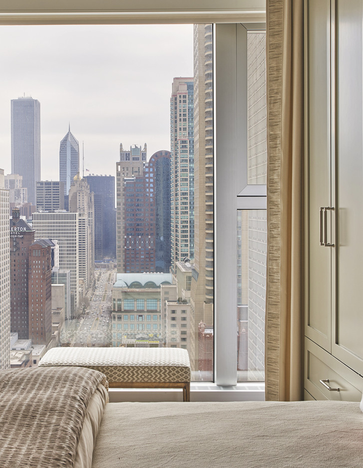 Atemberaubende Aussichten und ein raffiniertes Innenraumdesign machen diese repräsentative Wohnung im Herzen der Gold Coast einzigartig. Sowohl die gemeinschaftlich genutzten Bereiche als auch die individuellen Zimmer sind gleichermaßen mit Licht durchflutet, das durch die großen Glaswände mit Blick auf die berühmtesten Wahrzeichen der Stadt gelangt. Das Projekt wurde vom amerikanischen Boutique-Studio Kim Scodro Interiors entworfen und hält die Atmosphäre in einem perfekten Gleichgewicht zwischen der klassizistischen Gesamtstruktur und einem Hauch von Exzentrik, der für bestimmte Räume reserviert ist. Zu diesen gehört das beeindruckende Badezimmer, das – im Gegensatz zu den hellen, neutralen Tönen der restlichen Wohnung – durch die Gold- und Schwarztöne der Decken und Wandverkleidungen, die warmen Töne der Messing-Accessoires und den kostbaren Marmor des Waschtischs Epoque mit den exklusiven Armaturen Vip Time im 30er-Jahre-Stil beeindruckt.