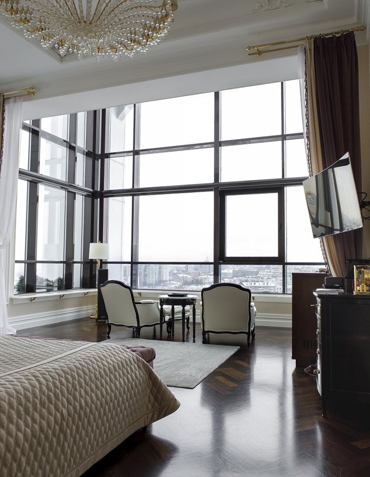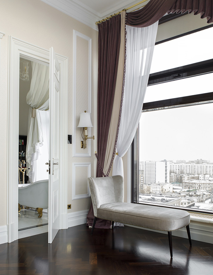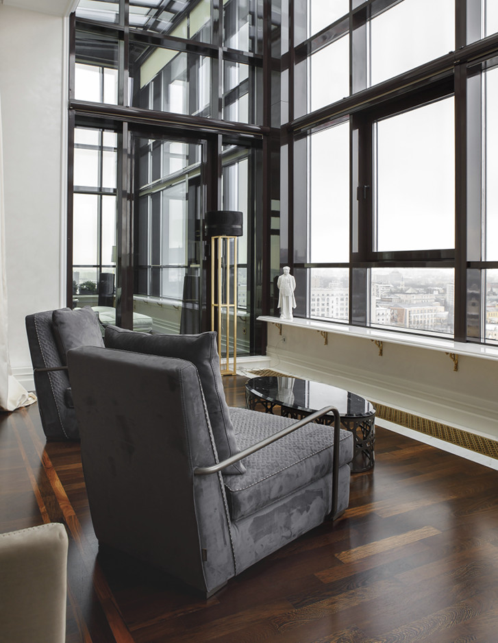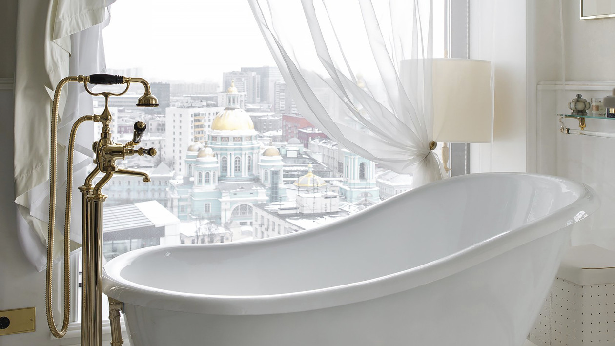 Eindrucksvoll steht die Badewanne Regina vor einem großen Fenster, das einen atemberaubenden Blick auf das historische Stadtzentrum bietet. Sie bildet das überraschende Moment, das dem Hauptbadezimmer dieser repräsentativen Moskauer Wohnung seine Einzigartigkeit verleiht.