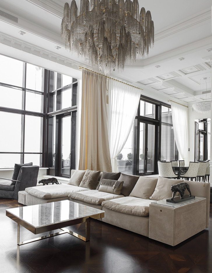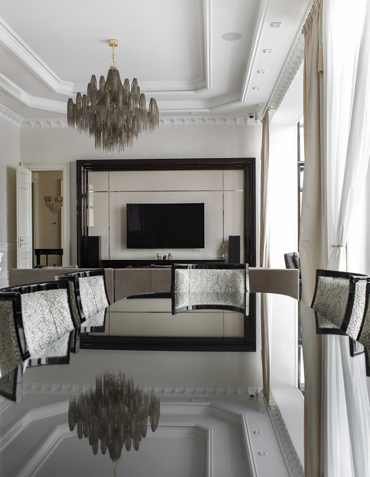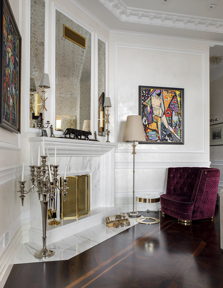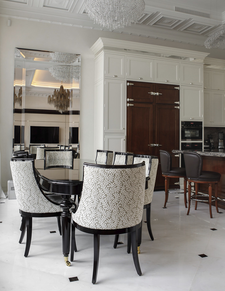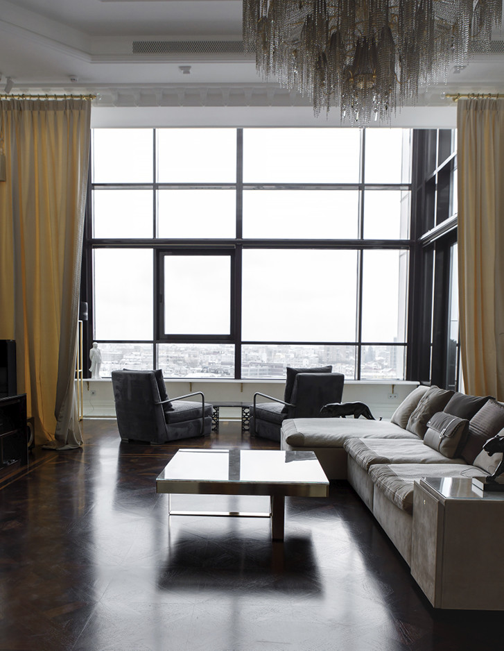 Eindrucksvoll steht die Badewanne Regina vor einem großen Fenster, das einen atemberaubenden Blick auf das historische Stadtzentrum bietet. Sie bildet das überraschende Moment, das dem Hauptbadezimmer dieser repräsentativen Moskauer Wohnung seine Einzigartigkeit verleiht.