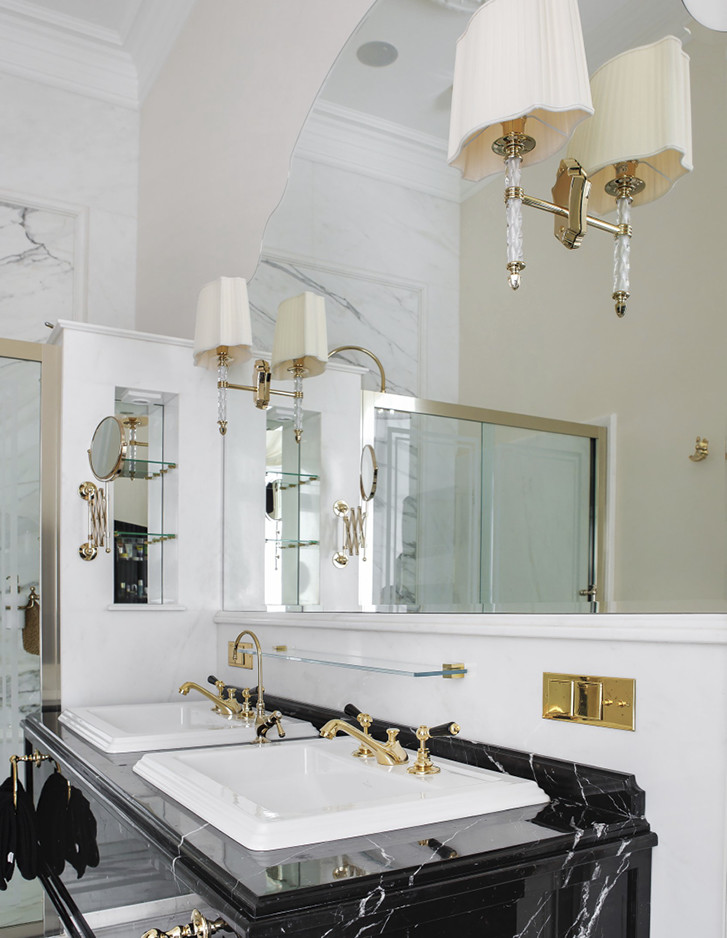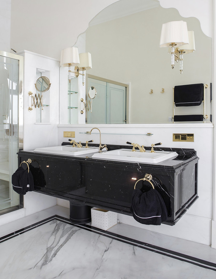 Die Innenarchitektin Nadezhda Dranzhevskaya entschied sich für Einrichtungsgegenstände, Sanitärkeramik, die Dusche, Armaturen, Accessoires, Handtuchwärmer, Wandleuchten und Lampen aus den exklusivsten Kollektionen von Devon&Devon und kombinierte sie in einem raffinierten Farbenspiel aus Kontrasten zwischen Weiß, Schwarz und Gold.