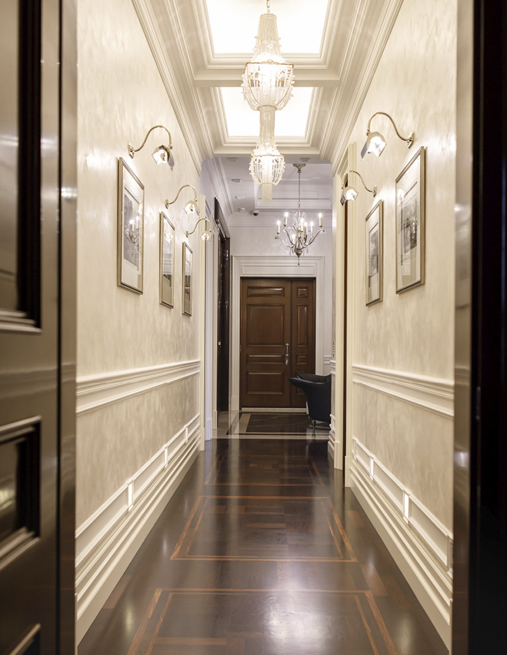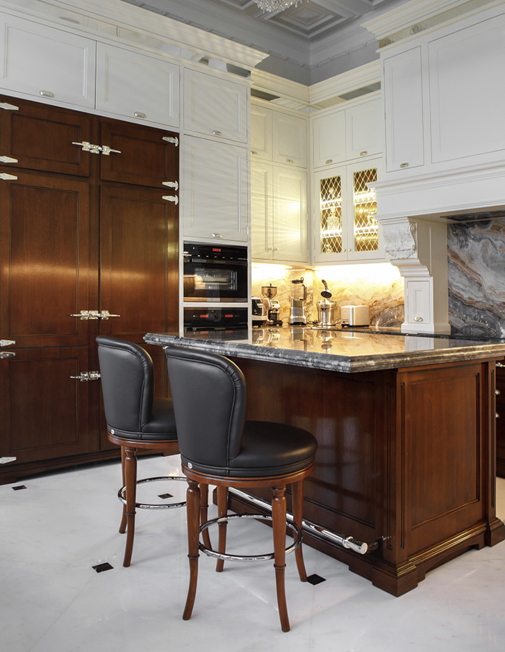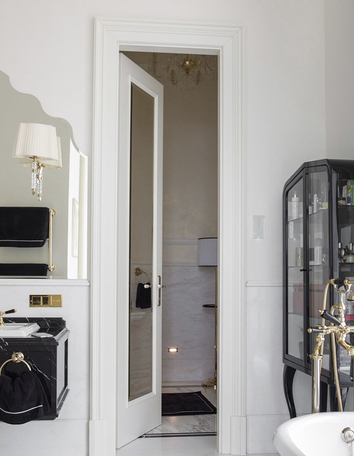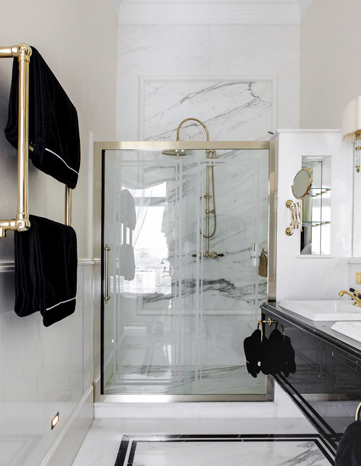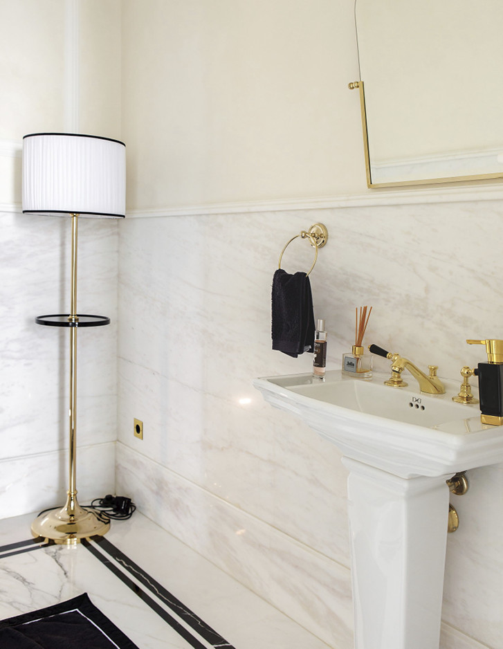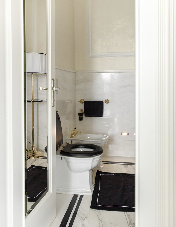 Die Bodenbeläge und Wandverkleidungen aus Calacatta-Marmor mit Einlagen aus schwarzem Marquinha-Marmor erinnern an die durchgehend klassische schlichte Eleganz, die die übrigen Räumlichkeiten der vollständig mit maßgefertigten italienischen Möbeln eingerichteten Wohnung bestimmt.