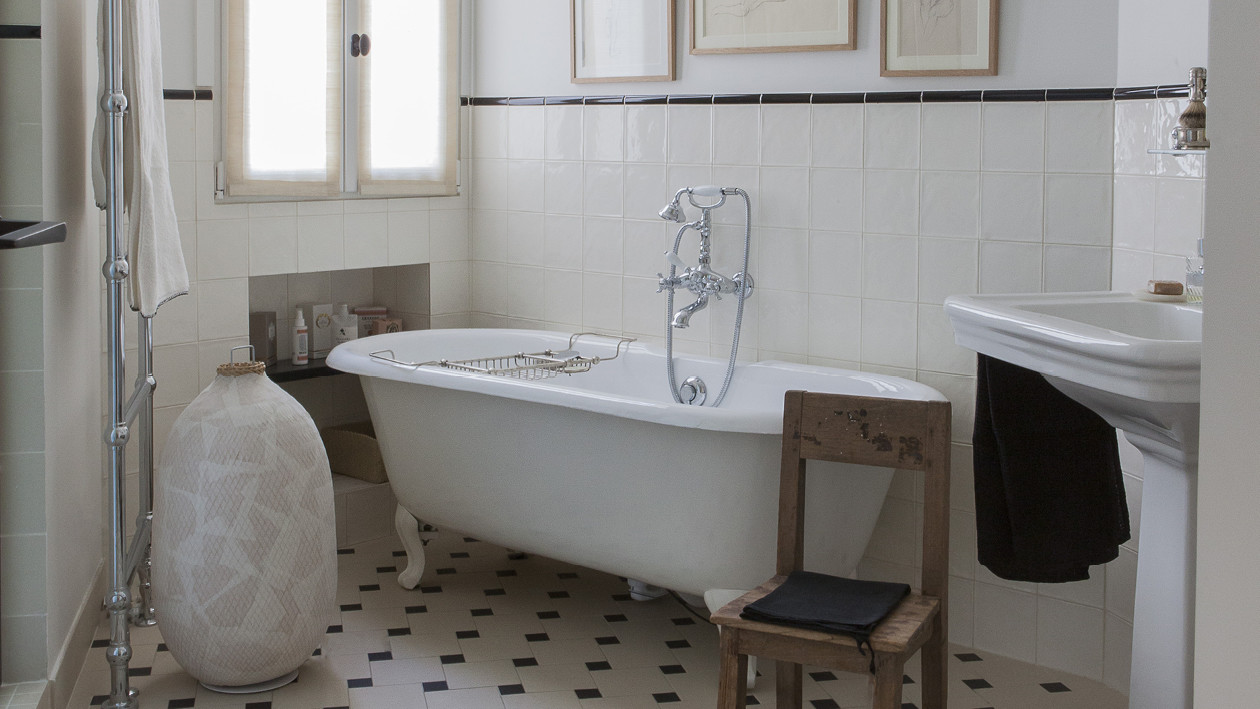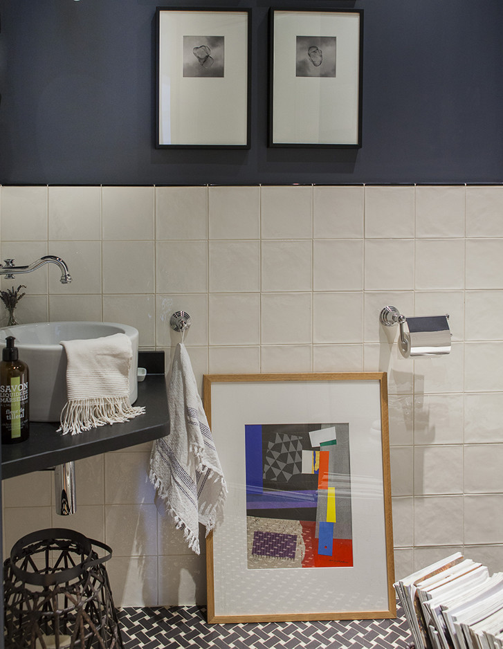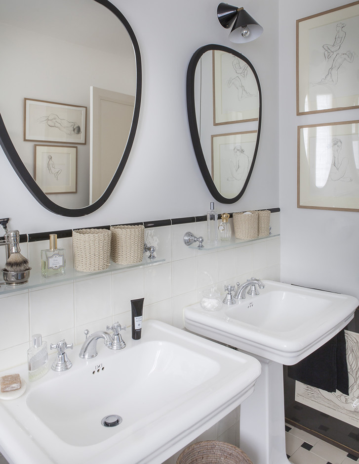Das funktionelle und gut organisierte Badezimmer ist ein kleines Meisterwerk farblicher und formaler Harmonie, in dem die Waschbecken Etoile perfekt mit den Böden aus Keramiksteinzeug Heritage und Mosaic, der freistehenden Badewanne Draycott und den antiken Prints, die die Wände schmücken, harmonieren.