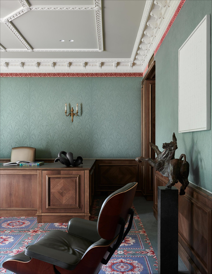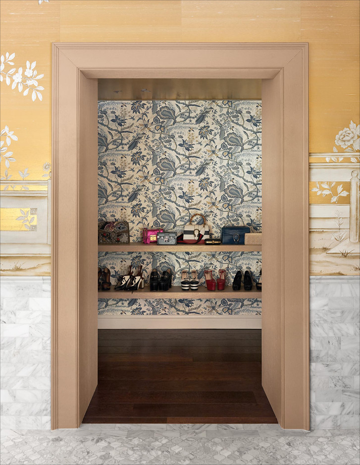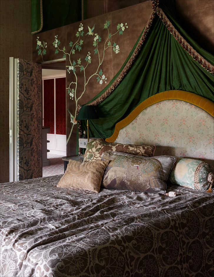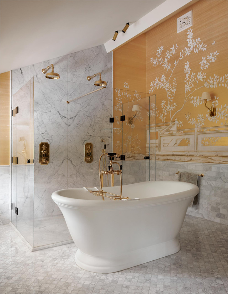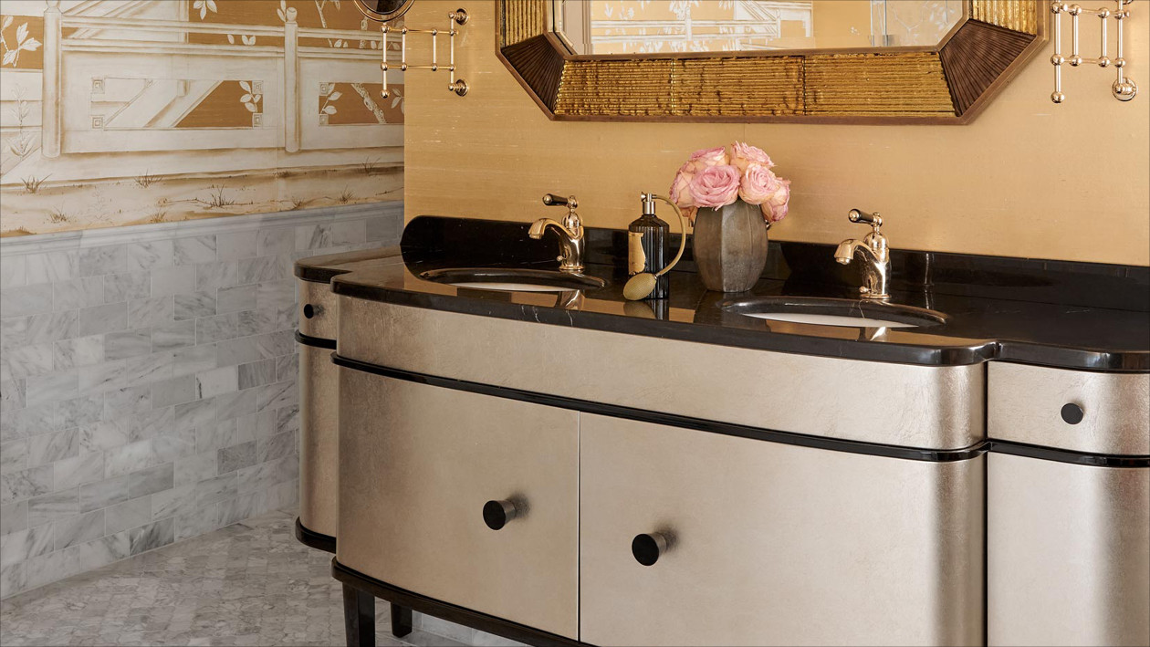Ein Stück Frankreich mitten in Holland: ein kleines Wunder, das dem Büro Ethnic Chic - Home Couture für ein luxuriöses Privathaus in Naarden gelang, einem kleinen, nur zwanzig Minuten von Amsterdam entfernten Dorf. Die Inneneinrichtung inspirierte sich bis ins kleinste Detail an der traumhaften Atmosphäre des Hotels George V in Paris, das nach Meinung der wohlhabenden Hausbesitzer der schönste und entspannendste Ort der ganzen Welt ist. Der unverwechselbare Stil des historischen Pariser Hotels spiegelt sich sowohl in den Farben und Texturen als auch in den stilgerechten Möbeln und eleganten, handbemalten Seidentapeten wider, die die Wände des glamourösen Herrenbadezimmers zieren. Ein perfektes Ambiente für den edlen, mit Blattgold verzierten Waschbeckenschrank Double Music und die zeitlos elegante, freistehende Badewanne Aurora.