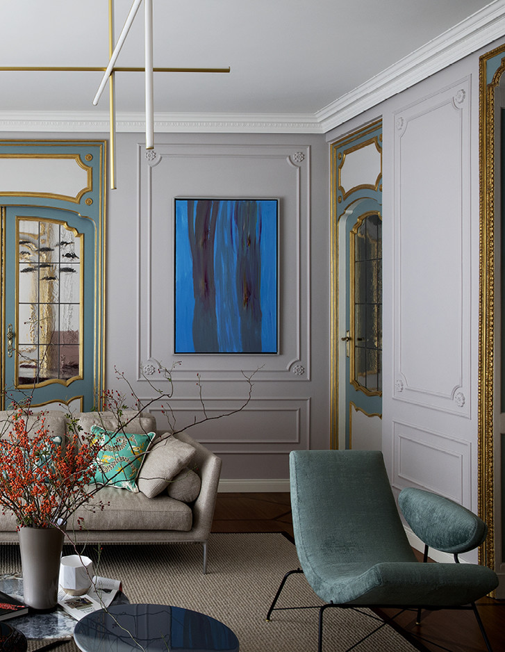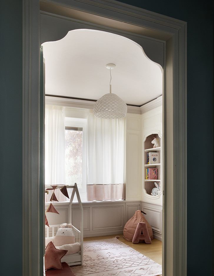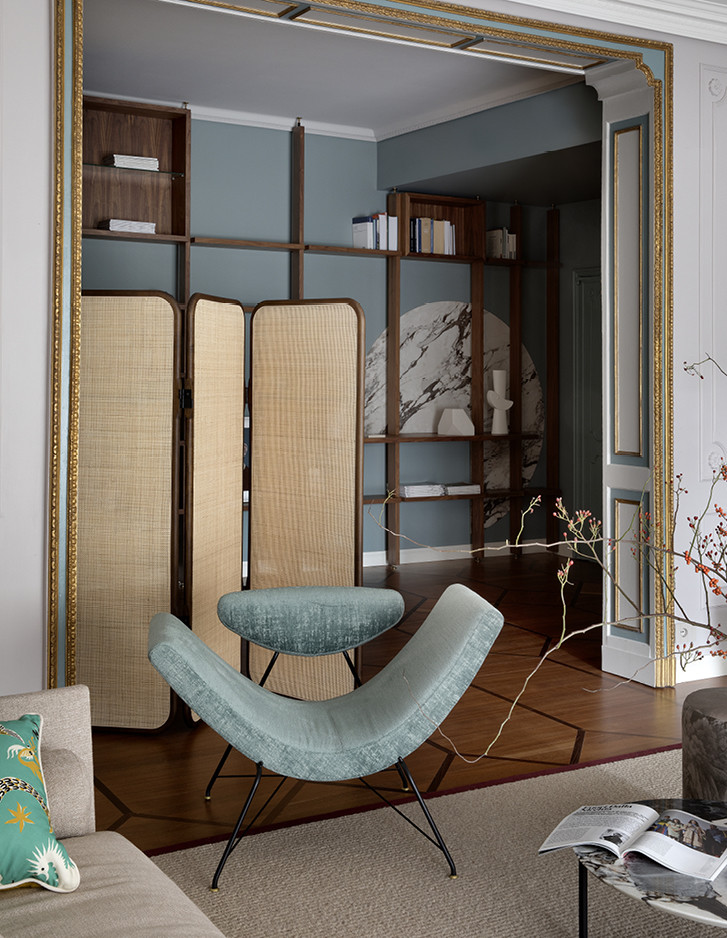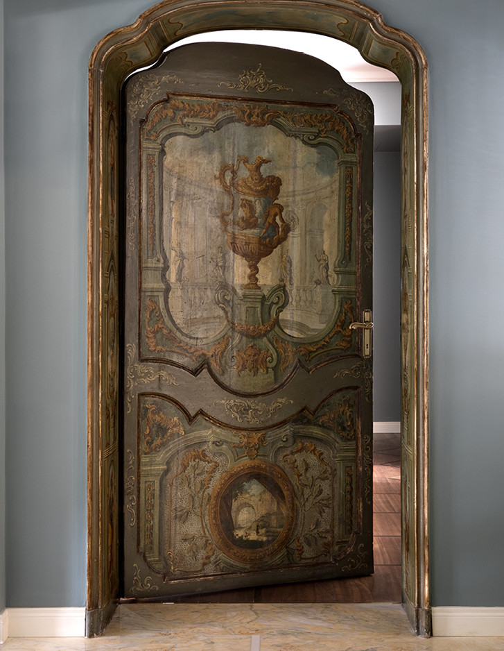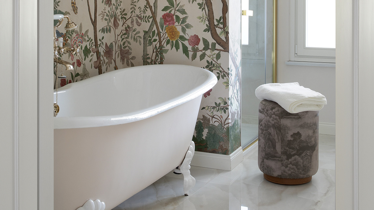 Im exklusivsten Stadtteil von Turin wurde eine historische Familienresidenz vom Studio Fragomeli & Partners zu einem gleichermaßen kostbaren wie erstaunlichen Kleinod umgestaltet. Eine gedämpfte Farbpalette, die durch Zwischentöne in Blau, Grau und Rosa bestimmt wird, erzeugt eine luftige Atmosphäre, die als Hintergrund für die geometrisch gestalteten Designermöbel, die Leuchten aus den fünfziger Jahren, die Gemälde zeitgenössischer Künstler und die orientalischen Akzente der Lackierungen und Dekore der Schränke dient. Doch gerade die harmonische Kombination der vielen verschiedenen und wertvollen Details verleiht diesem privaten Anwesen seinen außergewöhnlichen Charme. Der Eklektizismus der Einrichtung steht im Kontrast zum strengen Klassizismus der Bodenbeläge aus Holz und Marmor und der Originaltüren, die im 18. Jahrhundert für diese Residenz angefertigt wurden. Auch im Hauptbadezimmer herrscht ein perfektes Gleichgewicht zwischen Klassik und Moderne, das durch die raffinierte Eleganz des Möbelstücks Double Season und der Badewanne Admiral unterstrichen wird, umrahmt von einer Tapete mit Naturmotiven.