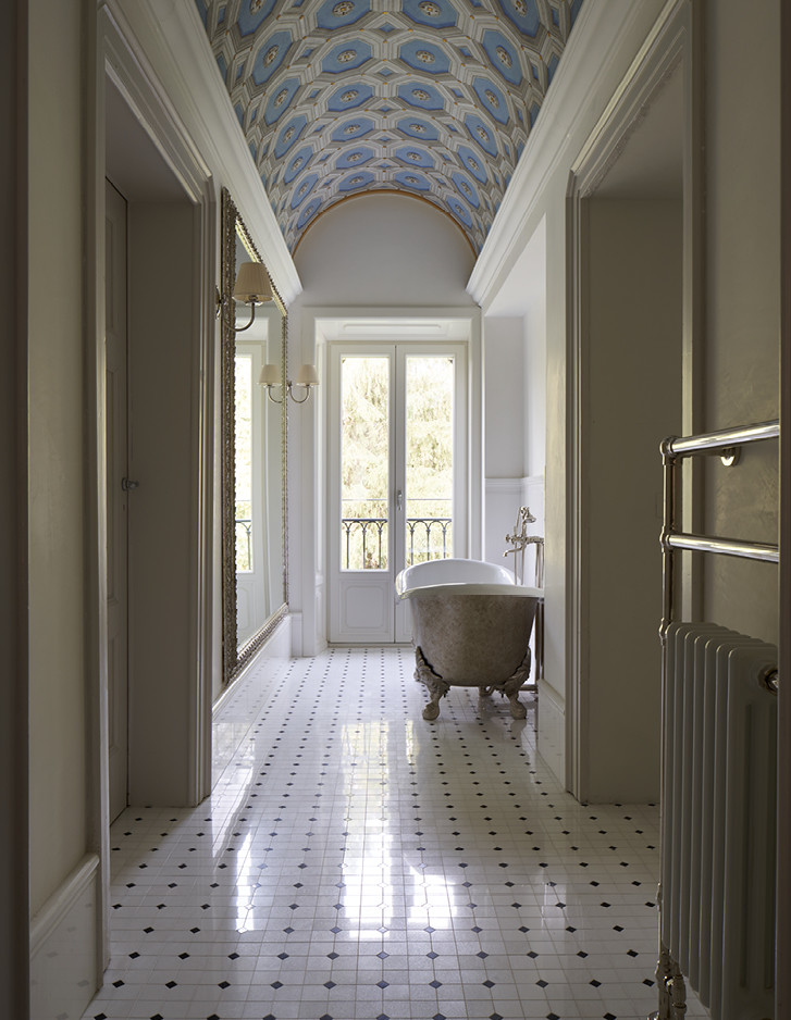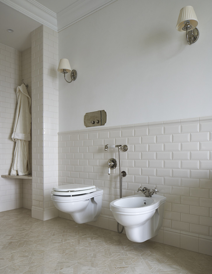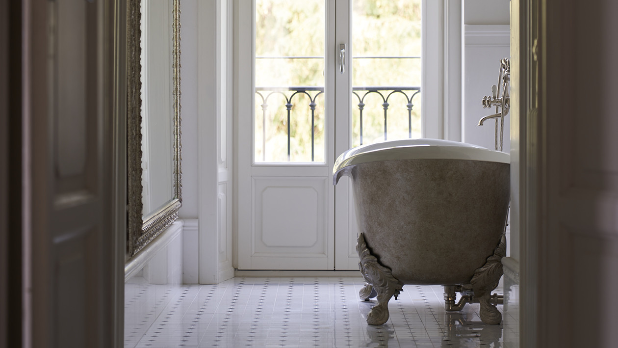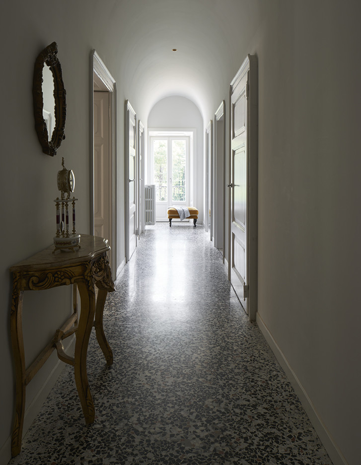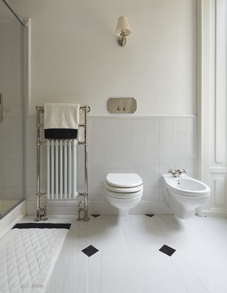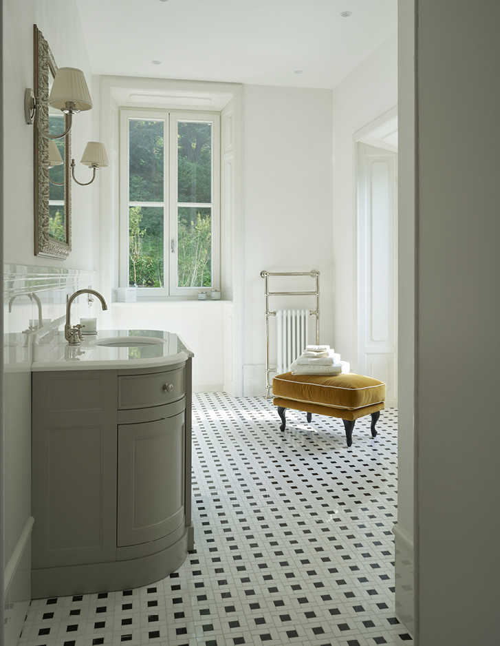 Diese prächtige neoklassizistische Villa, die seit 1878 am Ufer des wohl romantischsten der kleinen norditalienischen Seen liegt, ist heute das Feriendomizil einer italienischen Familie. Dank der umfangreichen, auf Erhaltung ausgerichteten Restaurierung durch das Architekturbüro BERTOLINI GALLI konnte die mondäne Atmosphäre vergangener Zeiten bewahrt werden, indem die Raumaufteilung und die wertvollen Originalausstattungen erhalten blieben. In den acht Badezimmern lassen die Geometrien der Fußböden, der neoromantische Stil der freistehenden Badewannen, der Vintage-Charakter der Handtuchwärmer, die Anklänge an das 20. Jahrhundert der Armaturen, die sachliche Eleganz der Keramikverkleidungen, der Charme der Lampen und Spiegel und die auf Weiß, Schwarz und neutrale Farben konzentrierte Farbpalette die Erinnerung an einen faszinierenden und geschichtsträchtigen Ort aufleben.