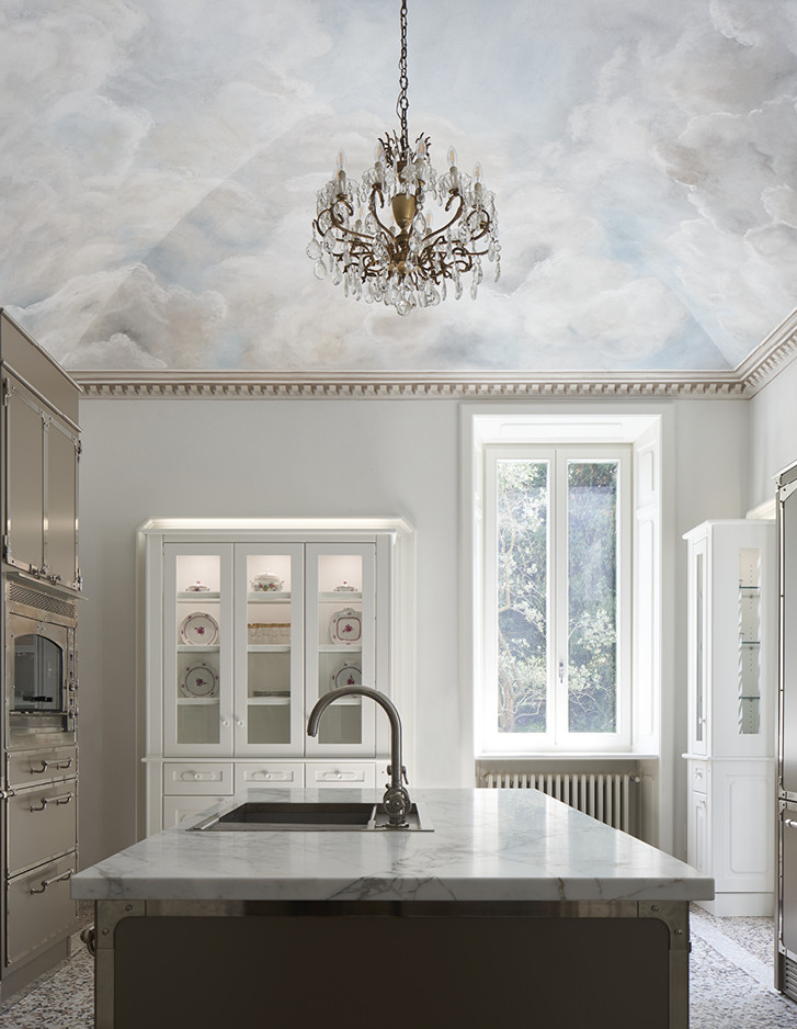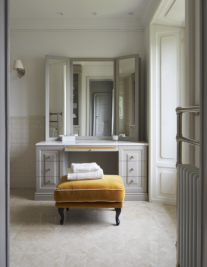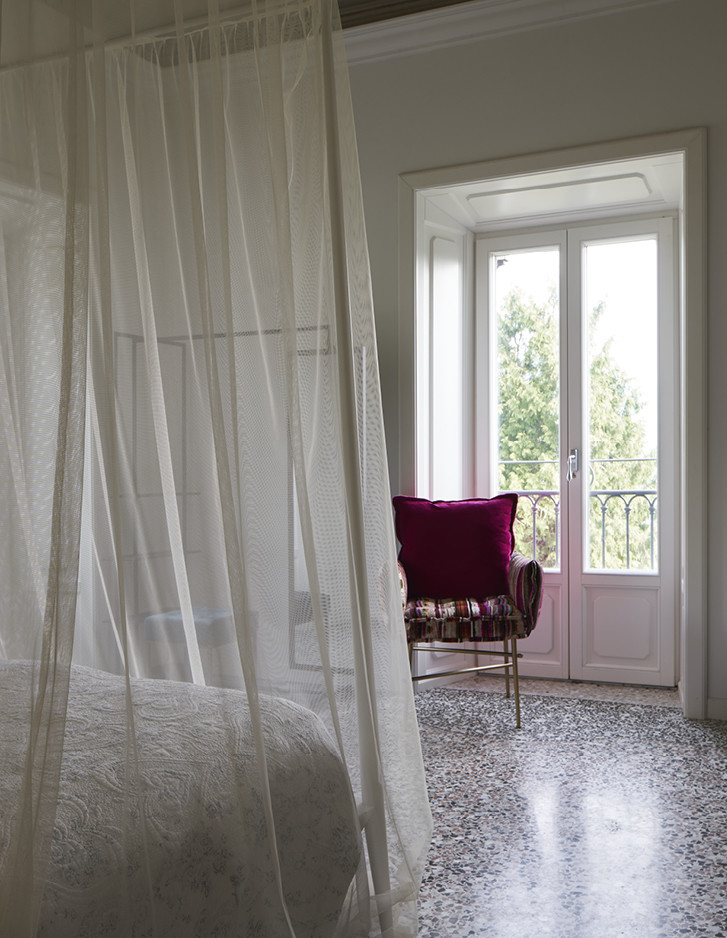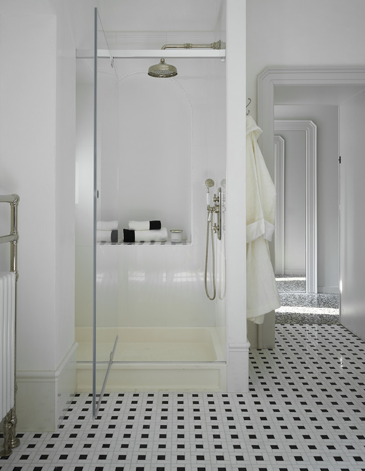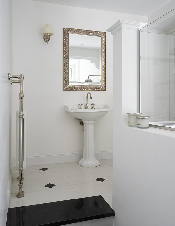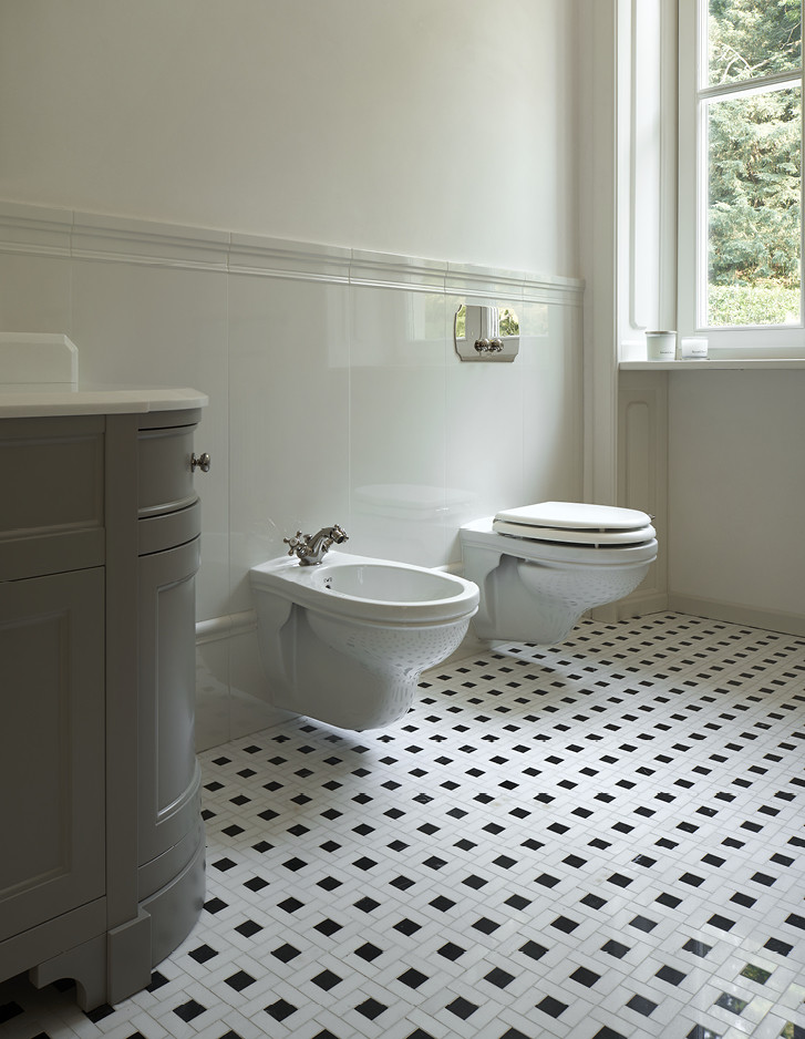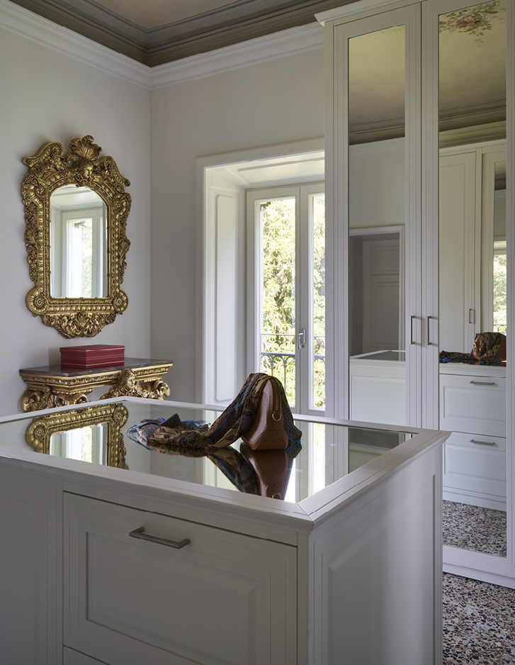 Diese prächtige neoklassizistische Villa, die seit 1878 am Ufer des wohl romantischsten der kleinen norditalienischen Seen liegt, ist heute das Feriendomizil einer italienischen Familie. Dank der umfangreichen, auf Erhaltung ausgerichteten Restaurierung durch das Architekturbüro BERTOLINI GALLI konnte die mondäne Atmosphäre vergangener Zeiten bewahrt werden, indem die Raumaufteilung und die wertvollen Originalausstattungen erhalten blieben. In den acht Badezimmern lassen die Geometrien der Fußböden, der neoromantische Stil der freistehenden Badewannen, der Vintage-Charakter der Handtuchwärmer, die Anklänge an das 20. Jahrhundert der Armaturen, die sachliche Eleganz der Keramikverkleidungen, der Charme der Lampen und Spiegel und die auf Weiß, Schwarz und neutrale Farben konzentrierte Farbpalette die Erinnerung an einen faszinierenden und geschichtsträchtigen Ort aufleben.