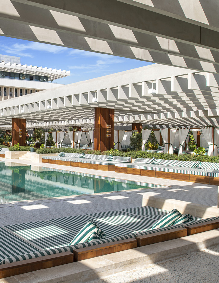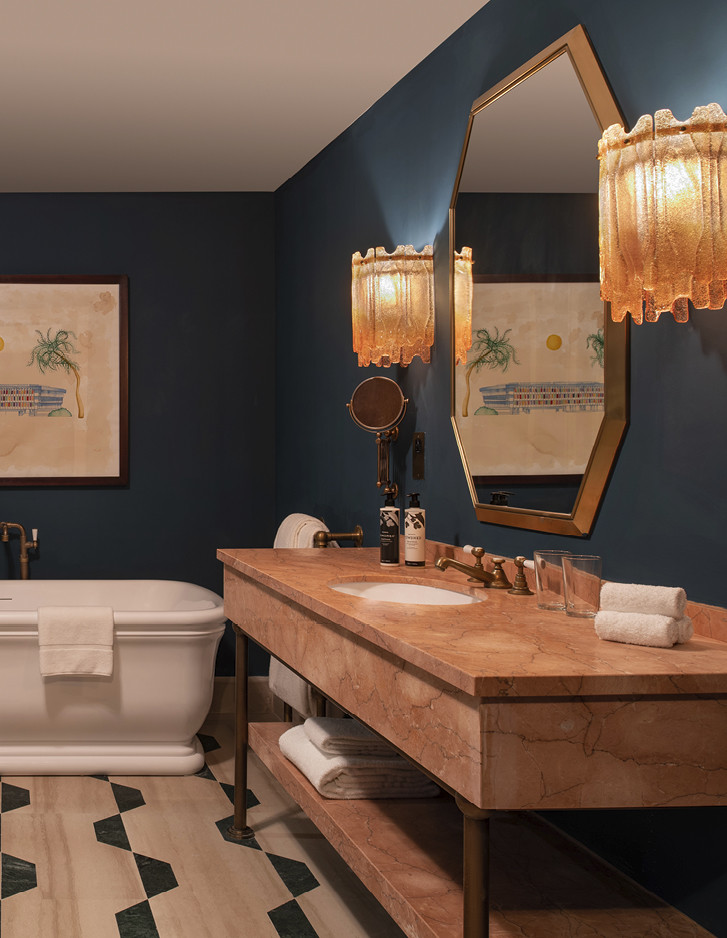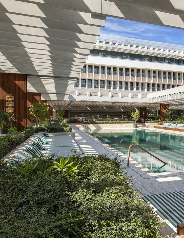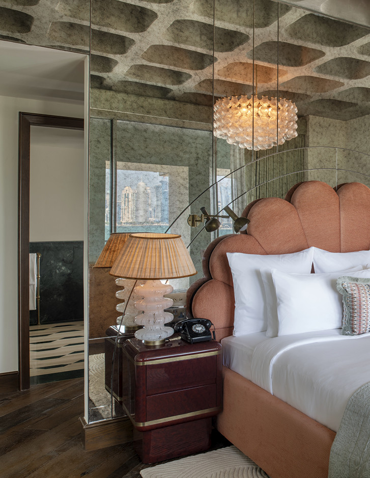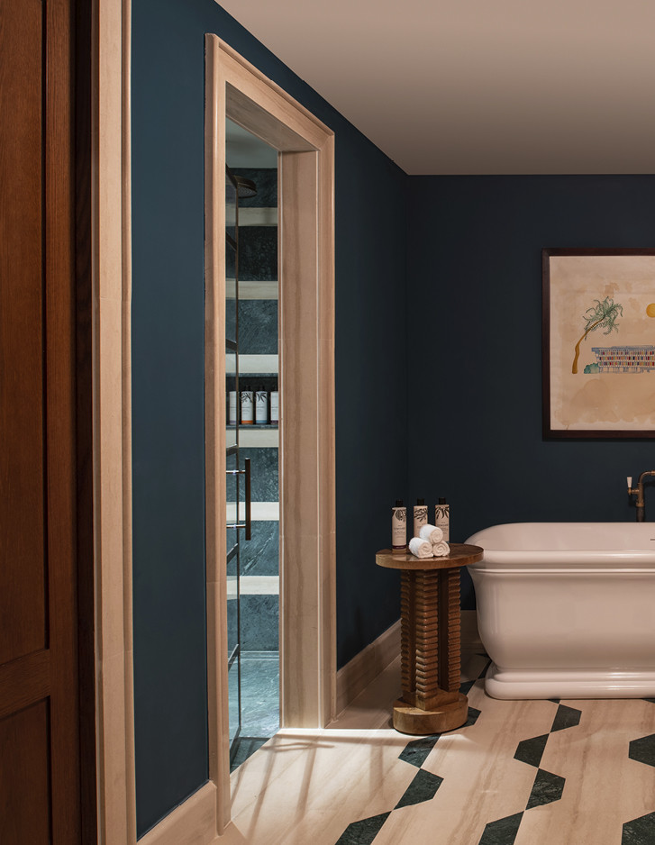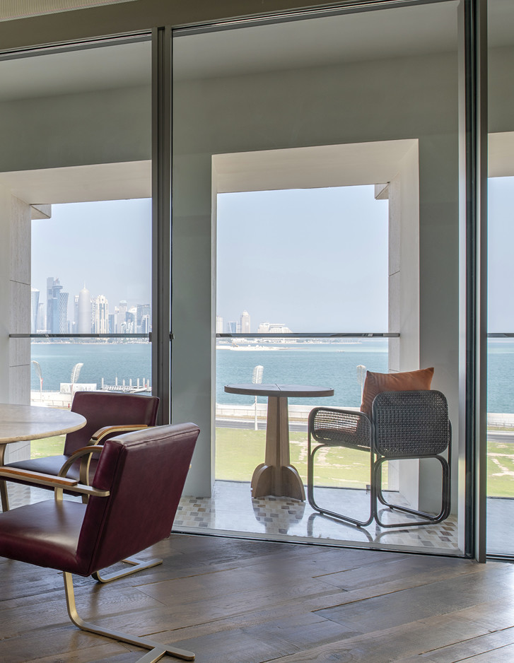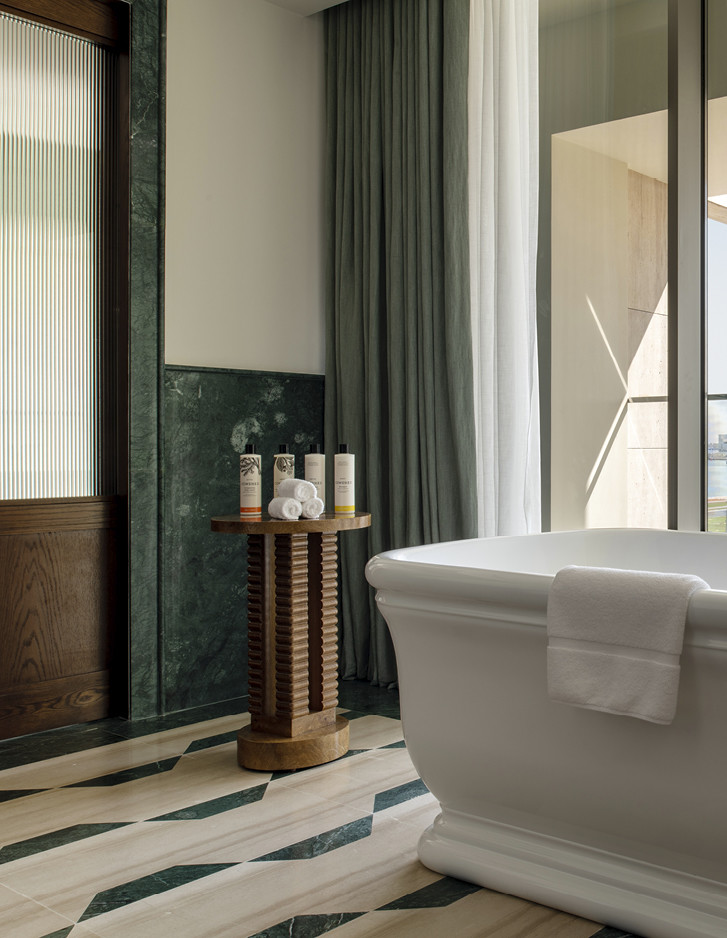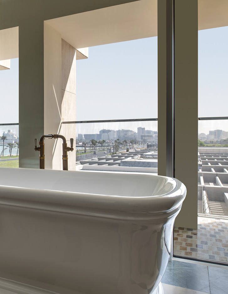 The Ned Doha blickt auf die berühmte Uferpromenade Corniche und ist nach London und New York das dritte Ned-Boutique-Hotel der Welt. Es befindet sich in einem geschichtsträchtigen Gebäude, das in den 1960er-Jahren als Sitz des Innenministeriums von Katar erbaut und anschließend nach einem Entwurf des renommierten Architekten David Chipperfield von Grund auf renoviert und schließlich von Soho House Design in einen Ort verwandelt wurde, der für ein Höchstmaß an Luxus und Gastlichkeit steht. Der Glamour der 1970er-Jahre spiegelt sich in den sieben Restaurants, dem exklusiven Club und den neunzig Zimmern und Suiten wider, die die ursprüngliche Architektur neu interpretieren, um den Ansprüchen einer besonders anspruchsvollen Kundschaft bezüglich Eleganz und Komfort zu genügen. Das Innendesign des Hotels ist eine harmonische Mischung aus Retro-Charme und zeitgenössischem Luxus und erfüllt die traditionell großzügigen Gemeinschaftsbereiche und Zimmer mit neuem Leben. Die historischen Details stehen in harmonischem Dialog mit edlen Holzmöbeln, weichen, farbenfrohen Polstermöbeln und kostbaren Kristalllüstern. In den großen, lichtdurchfluteten Bädern steht die imposante skulpturale Silhouette der Badewanne Hollywood im Mittelpunkt, deren Design an das goldene Zeitalter des amerikanischen Kinos und den exklusiven Lebensstil der Diven von einst erinnert.