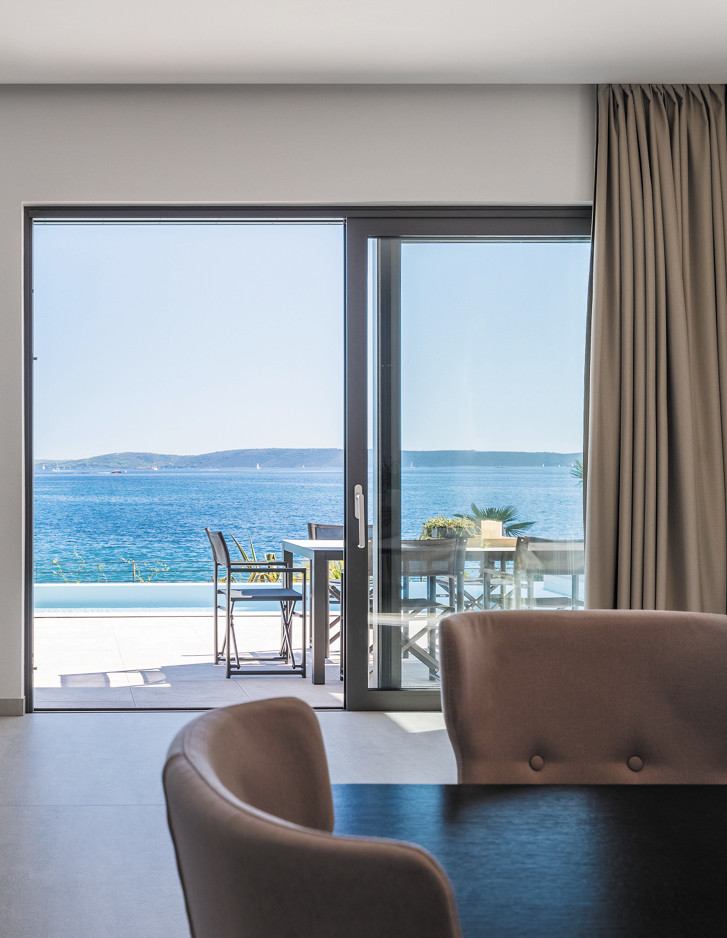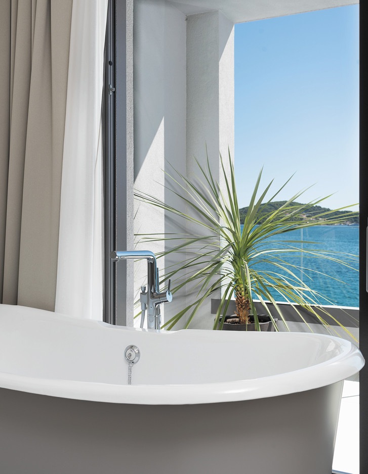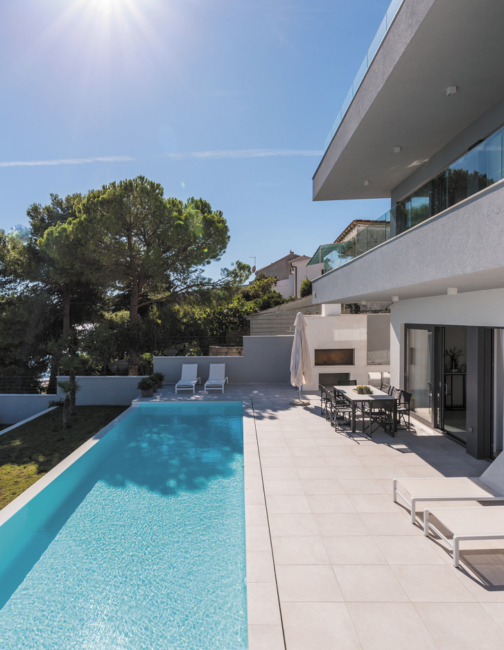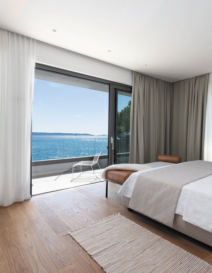 In einem kleinen Hafenstädtchen in der Nähe von Split, das einst ein Fischerdorf war und heute ein exklusives Touristenziel ist, konzipierten die kroatischen Architektur- und Innenarchitekturbüros Heros d.o.o und Koras Interiors eine luxuriöse 330 m² große Villa von Grund auf neu. Sowohl der Außen- als auch der Innenbereich wurden im Zeichen eines ausgeprägten Minimalismus gestaltet. Im Mittelpunkt stehen die Formen, während auf Dekorationen weitgehend verzichtet wurde. Es wurde alles auf die Natur ausgerichtet, deren Licht durch die großen Öffnungen, die auf den blauen Himmel und das blaue Meer ausgerichtet sind, jeden Raum durchflutet. Die meisten Möbel wurden von ortsansässigen Handwerkern entworfen und hergestellt. Aus Italien kommt hingegen die klassische Schönheit der freistehenden gusseisernen Badewanne Regal Colors, die eindrucksvoll vor dem Fenster des großen Hauptbadezimmers steht.