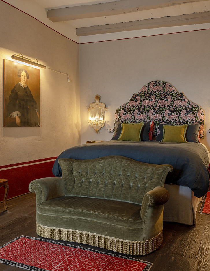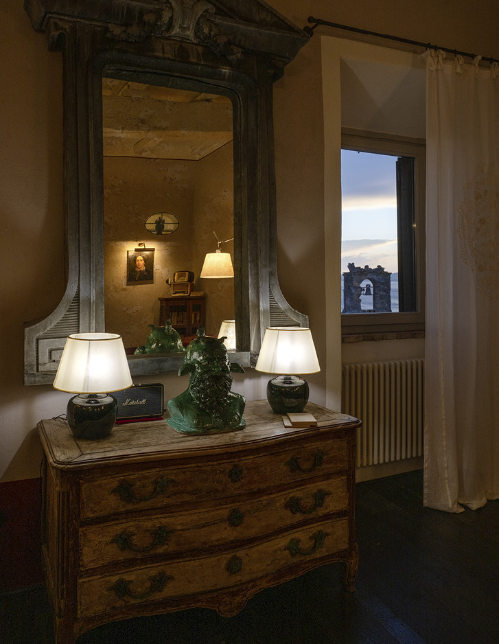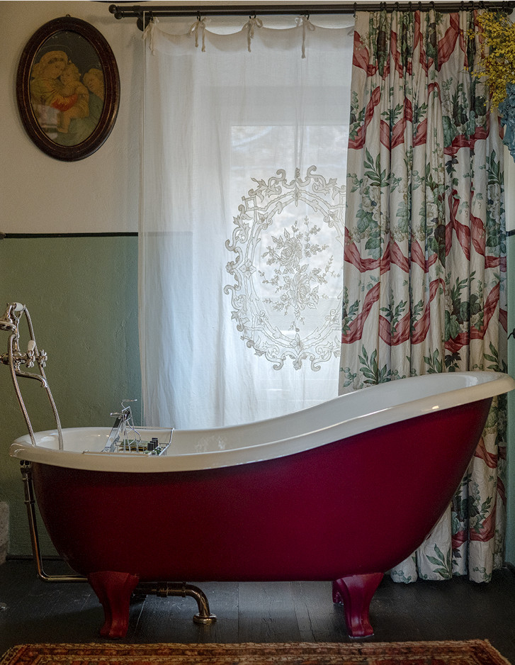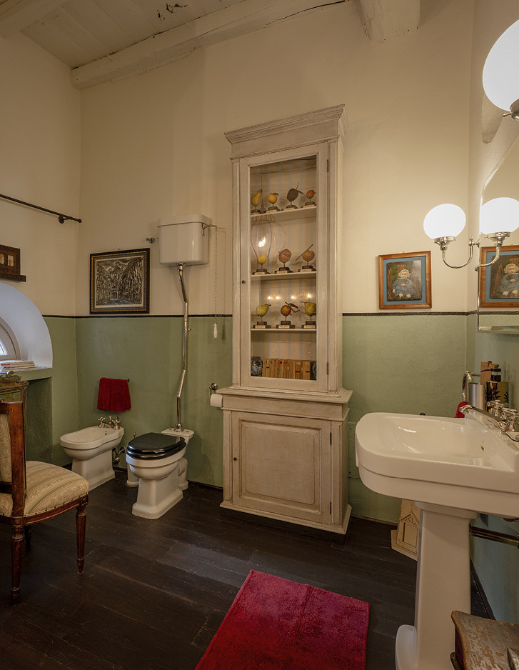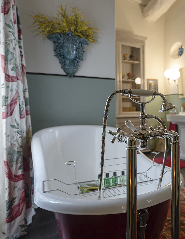 This new addition to the Corte della Maestà portfolio is a typically nineteenth-century idea of hospitality, with sumptuous antique porcelain and finely embroidered linens, family portraits, antique and spectacular French furniture, crystal lamps and silver candelabras. The Victorian design of the Regina bathtub—in a new deep purple colour—is perfect in the large bathroom with its sage green walls, colourful tiles and family mementos that all merge successfully to create layers of memories.
