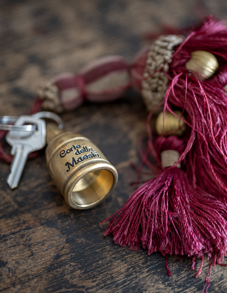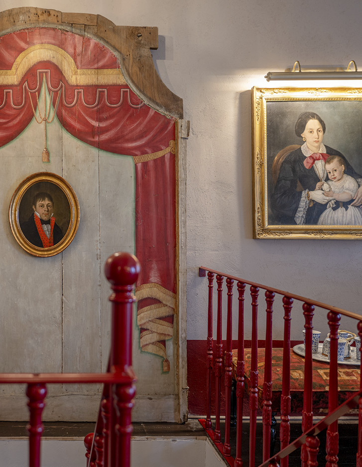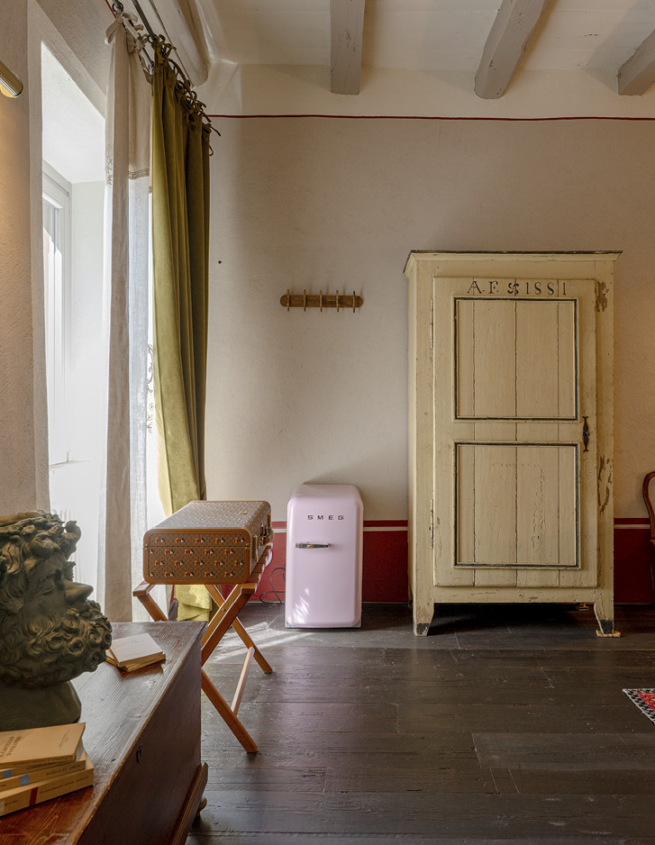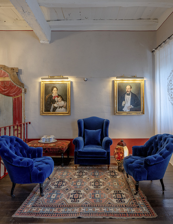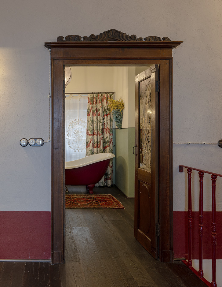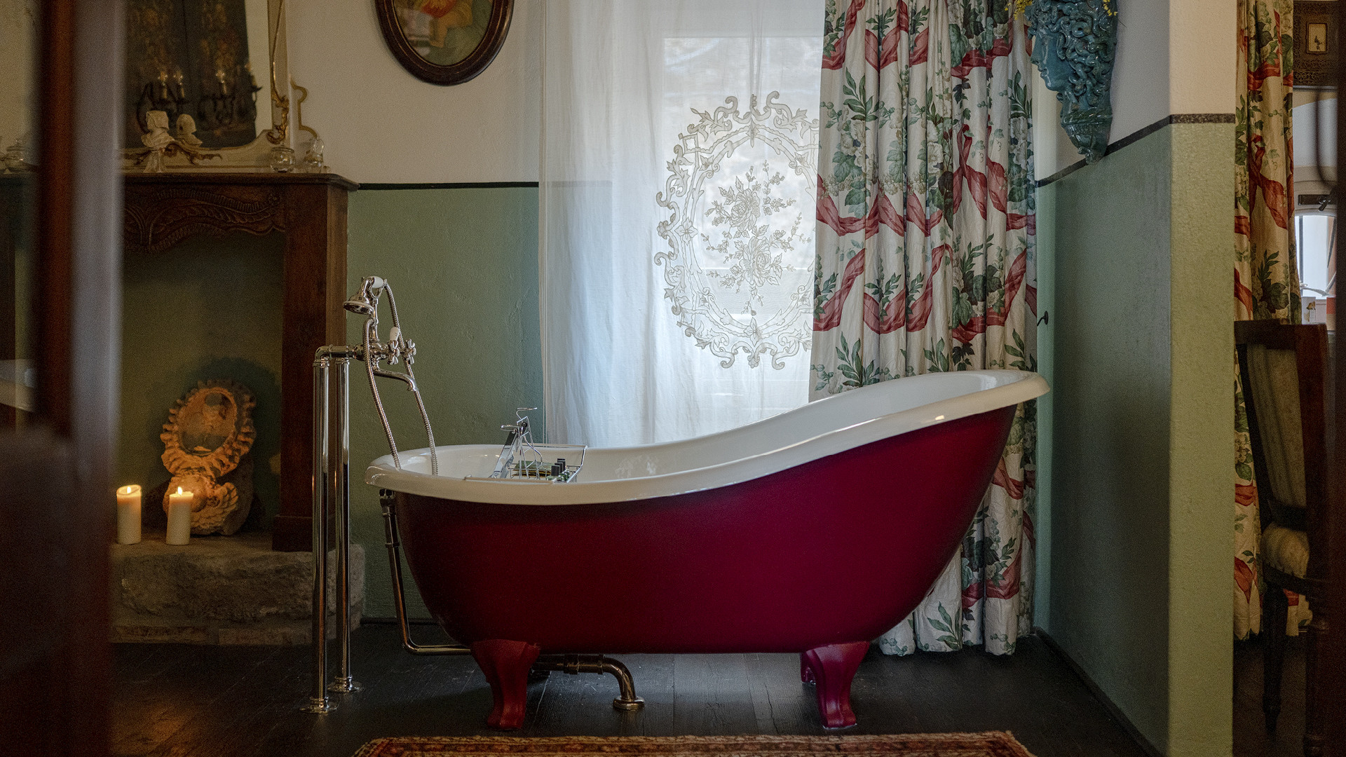 This new addition to the Corte della Maestà portfolio is a typically nineteenth-century idea of hospitality, with sumptuous antique porcelain and finely embroidered linens, family portraits, antique and spectacular French furniture, crystal lamps and silver candelabras. The Victorian design of the Regina bathtub—in a new deep purple colour—is perfect in the large bathroom with its sage green walls, colourful tiles and family mementos that all merge successfully to create layers of memories.