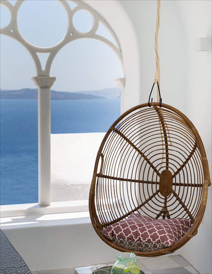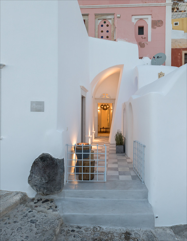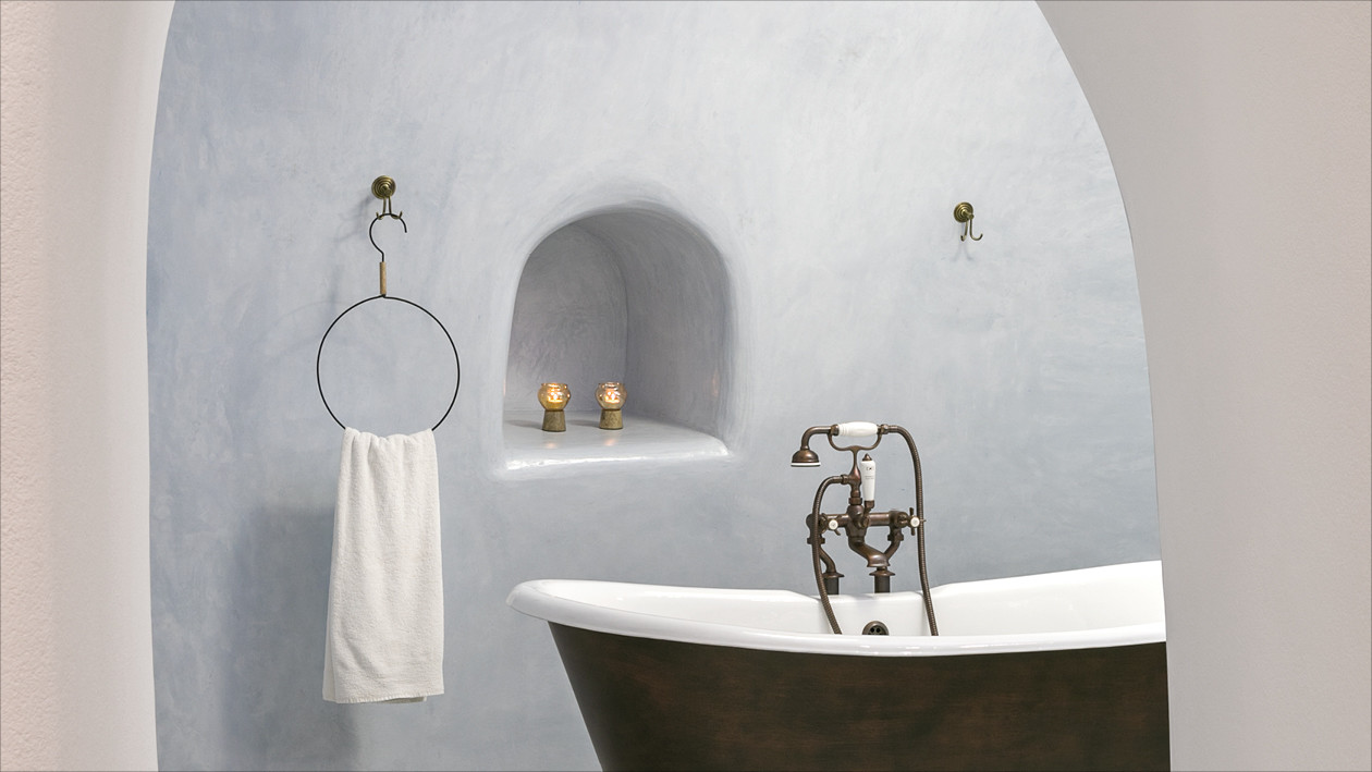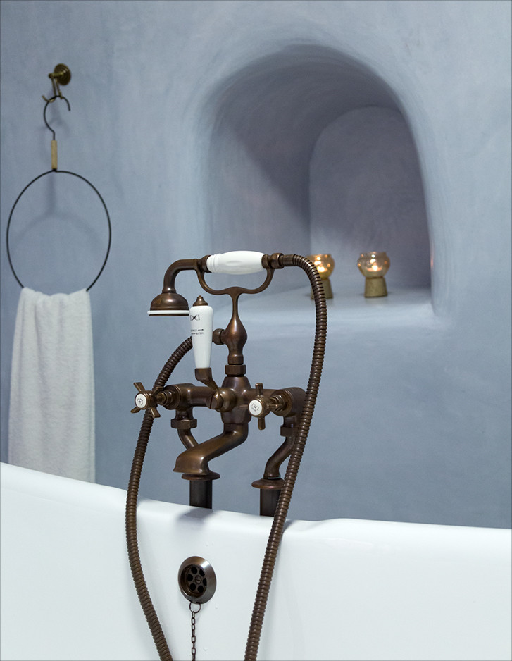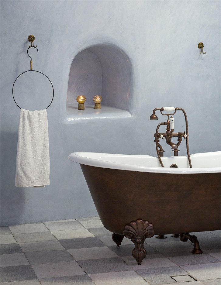An enchanting holiday home in Santorini (Greece) welcomes its guests halfway between the sea and the sky. Namaste Suites, located in Oia Village, preserves the traditional structure of the island houses, partly carved out of the volcanic stone. The white walls and the purity of architecture are brighten by an interior design with touches of Oriental mysticism, where every choice is suggested by an unlimited love for the quality handicrafts. Like the one that distinguishes the Admiral Copper Effect bathtub with Eagle legs in antique copper finish, chosen for the bathroom of the main suite.