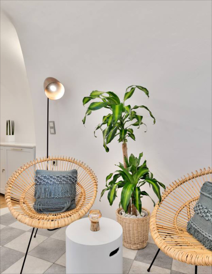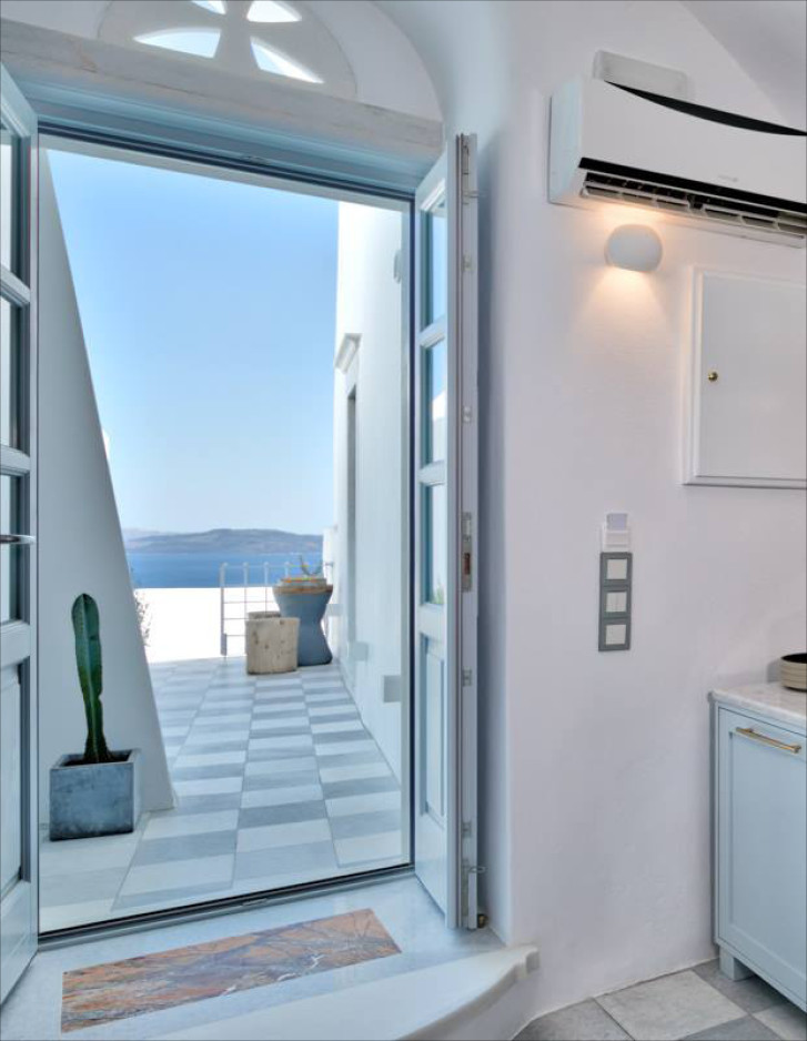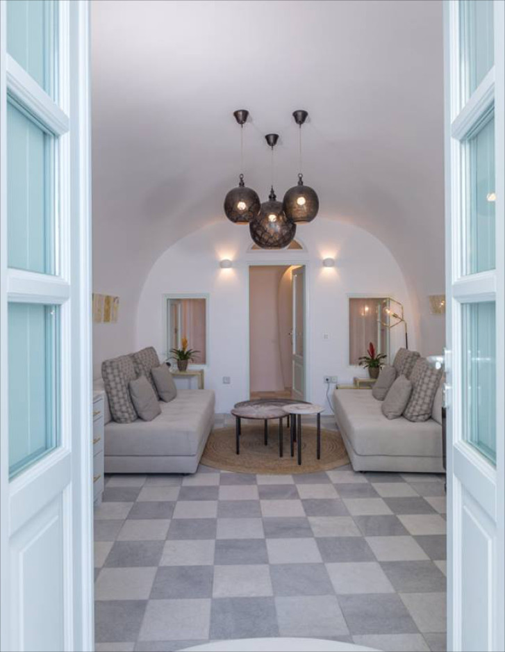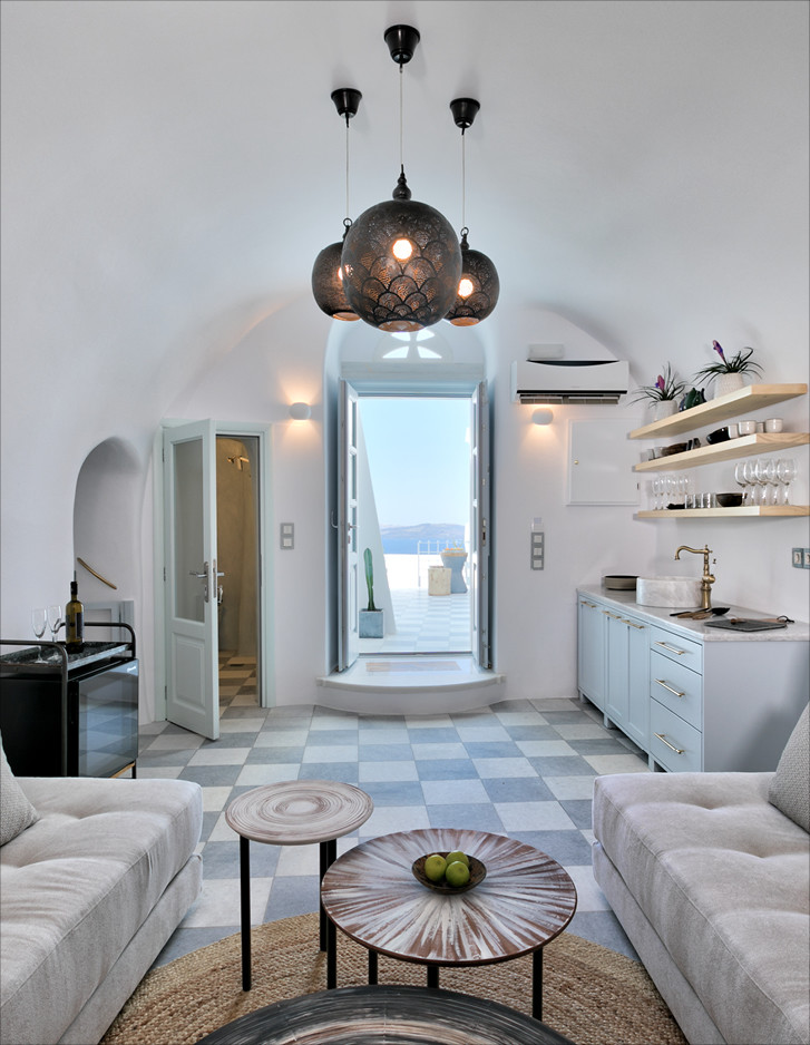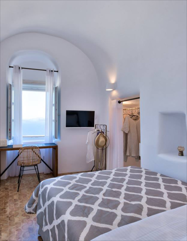 An enchanting holiday home in Santorini (Greece) welcomes its guests halfway between the sea and the sky. Namaste Suites, located in Oia Village, preserves the traditional structure of the island houses, partly carved out of the volcanic stone. The white walls and the purity of architecture are brighten by an interior design with touches of Oriental mysticism, where every choice is suggested by an unlimited love for the quality handicrafts. Like the one that distinguishes the Admiral Copper Effect bathtub with Eagle legs in antique copper finish, chosen for the bathroom of the main suite.