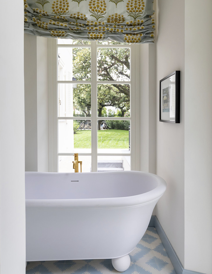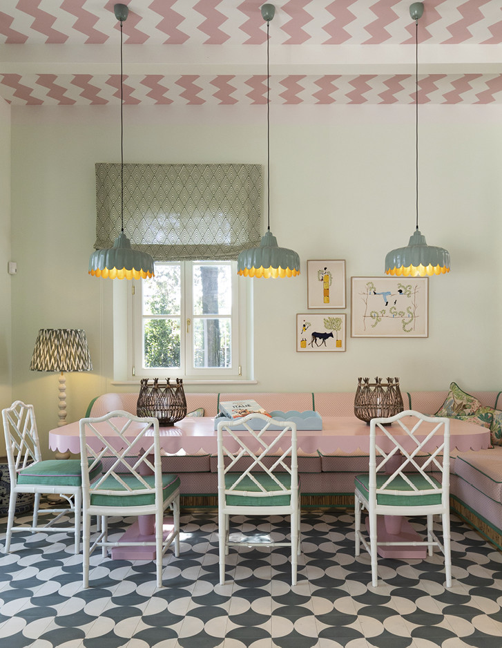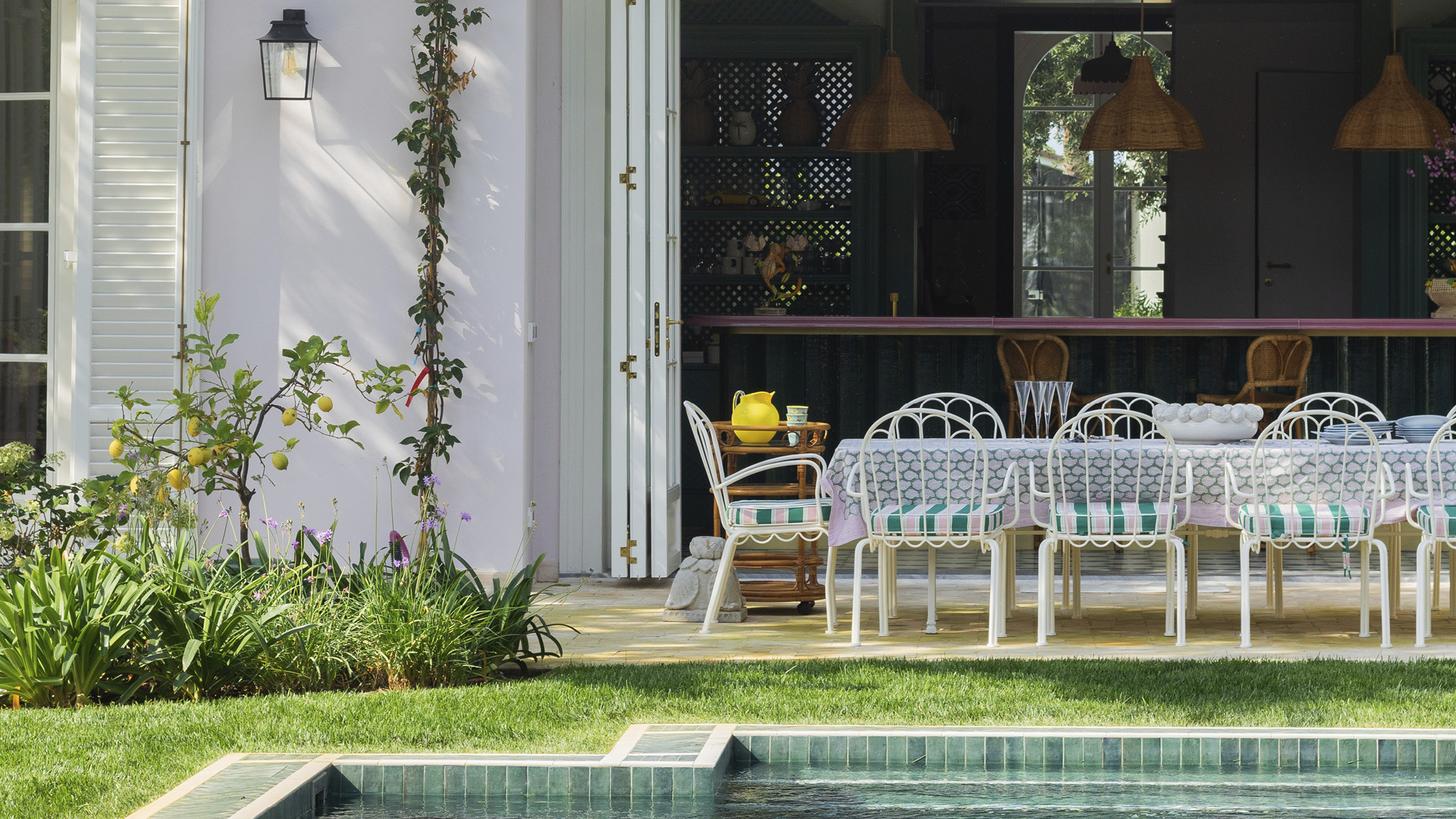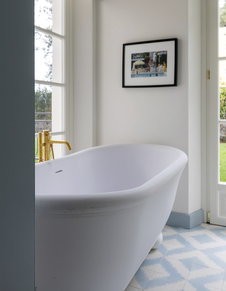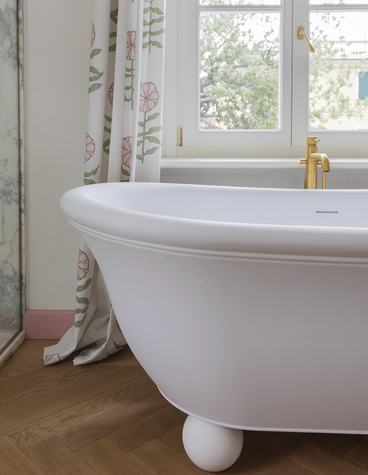 In the bathrooms, the playful exuberance of colour softens, allowing the focus to fall on the neo-romantic charm of the Aurora Bijoux White jewel-bathtub, chosen for both the master bathroom and the guest bathroom, which looks directly onto the beautiful garden and pool.