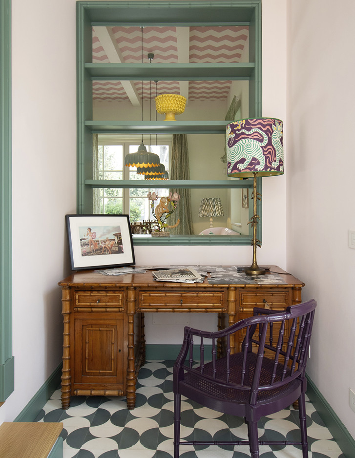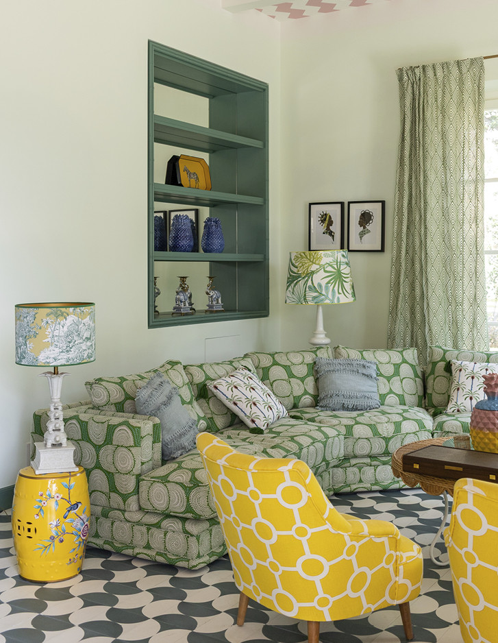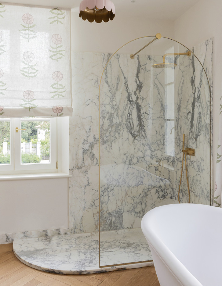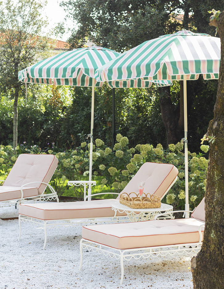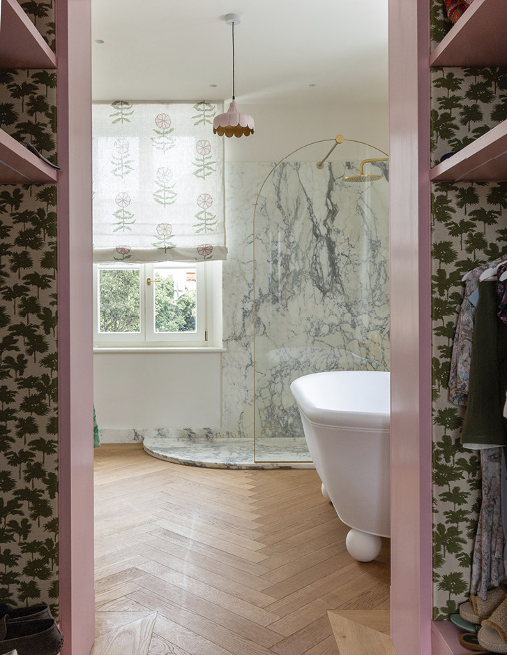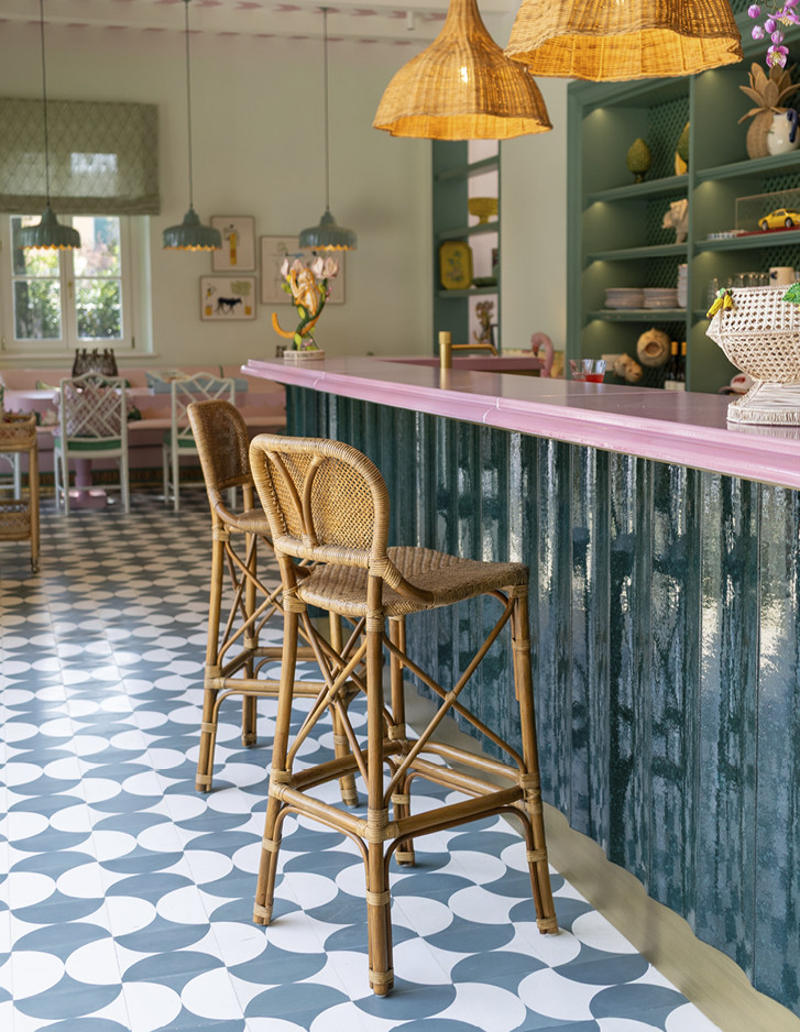In the bathrooms, the playful exuberance of colour softens, allowing the focus to fall on the neo-romantic charm of the Aurora Bijoux White jewel-bathtub, chosen for both the master bathroom and the guest bathroom, which looks directly onto the beautiful garden and pool.