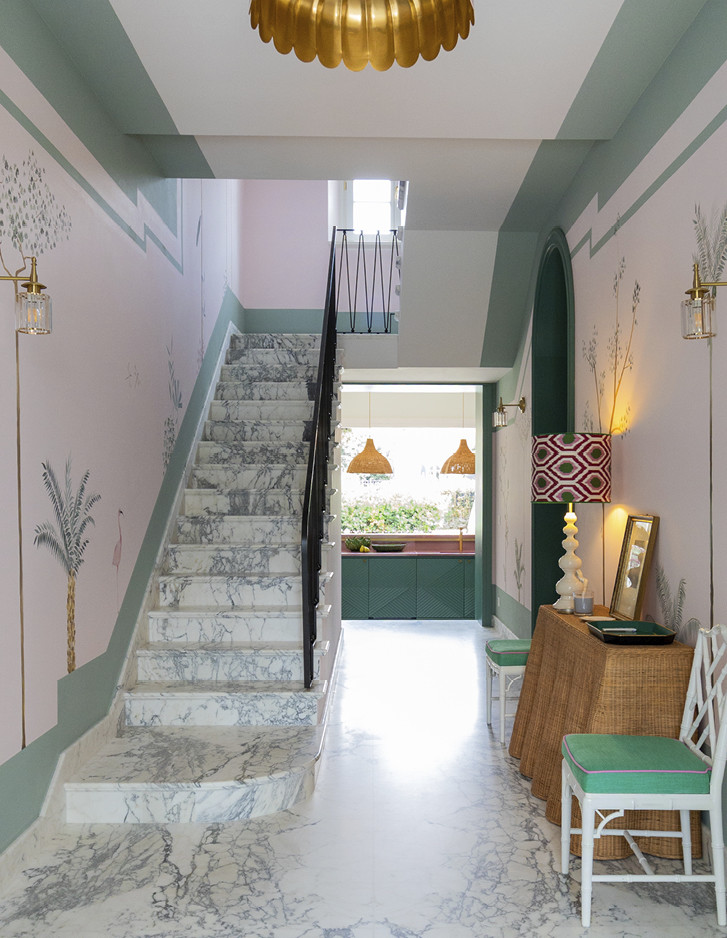 The project shares a colour palette that is both vibrant and subtle, anchored in pastel pinks and blues, aquamarine greens, and deep aubergine, with unexpected bursts of colour that achieve a flawless balance between airy lightness and formal elegance. The walls, frescoed by a Dutch artist featuring motifs inspired by botany and nature, become theatrical backdrops for Art Nouveau furnishings with unmistakable flowing lines and for custom-designed furniture.